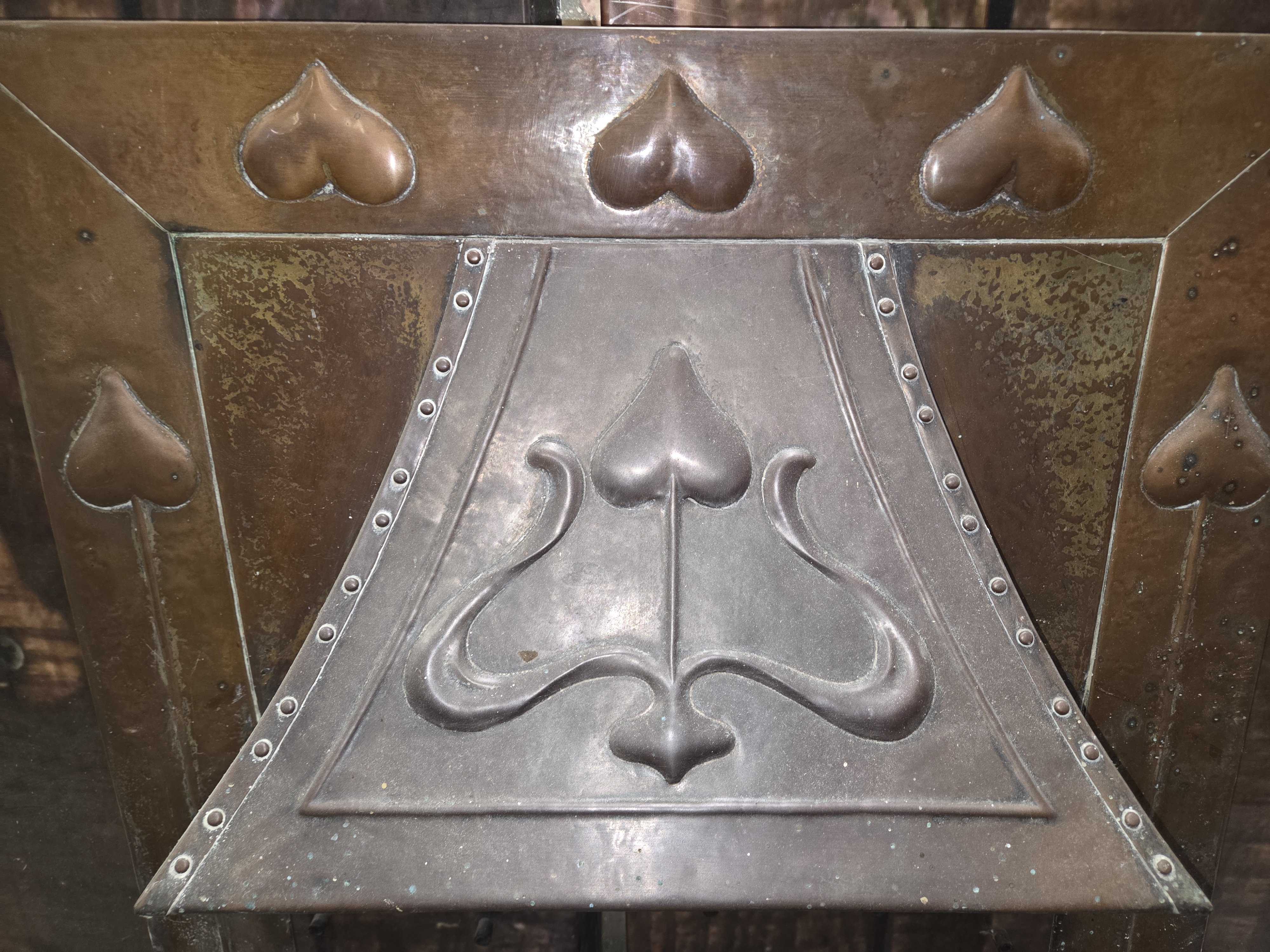 A brown and green patinated copper architectural fireplace hood featuring embossed heart motifs and a central stylised emblem.