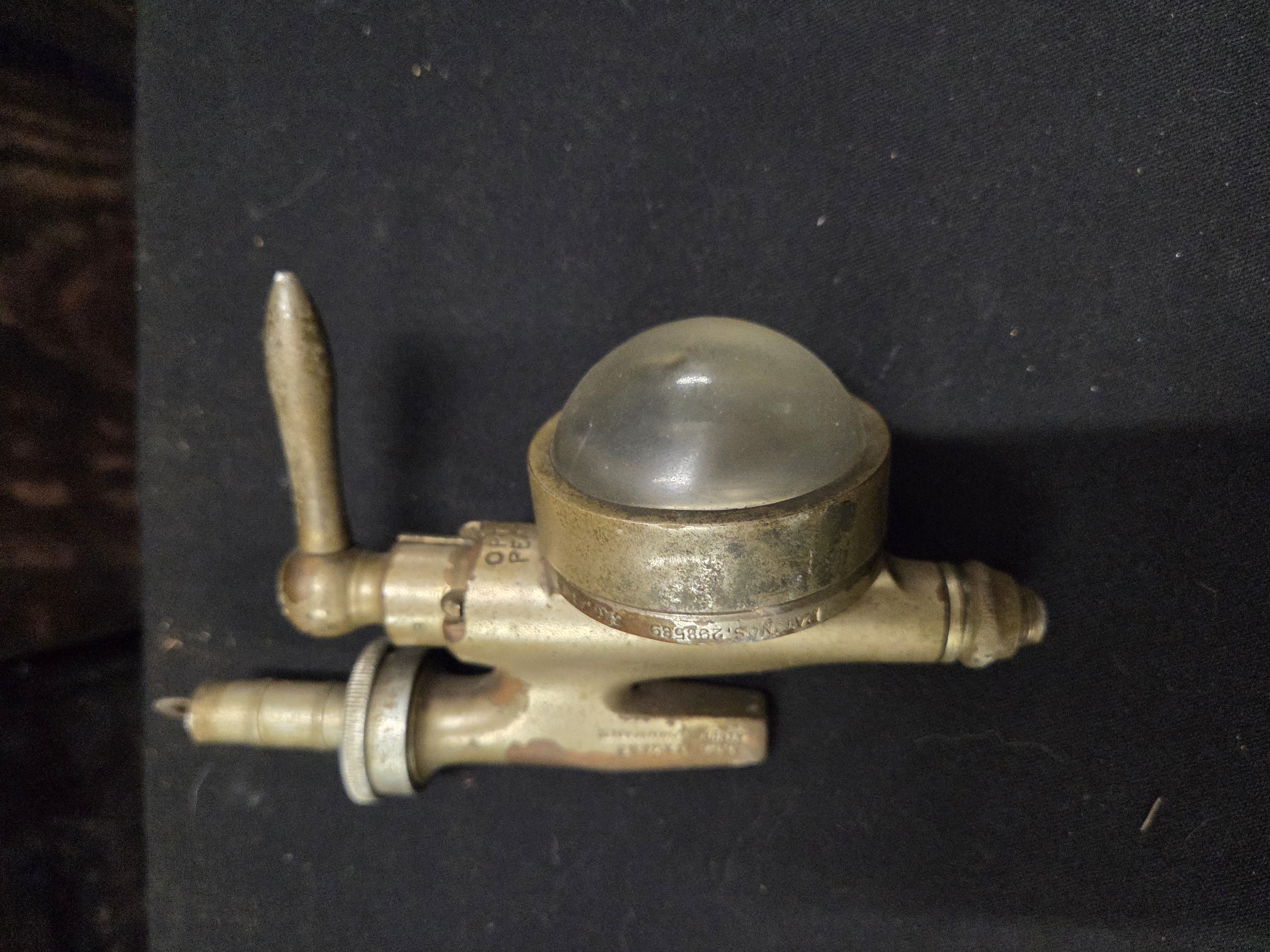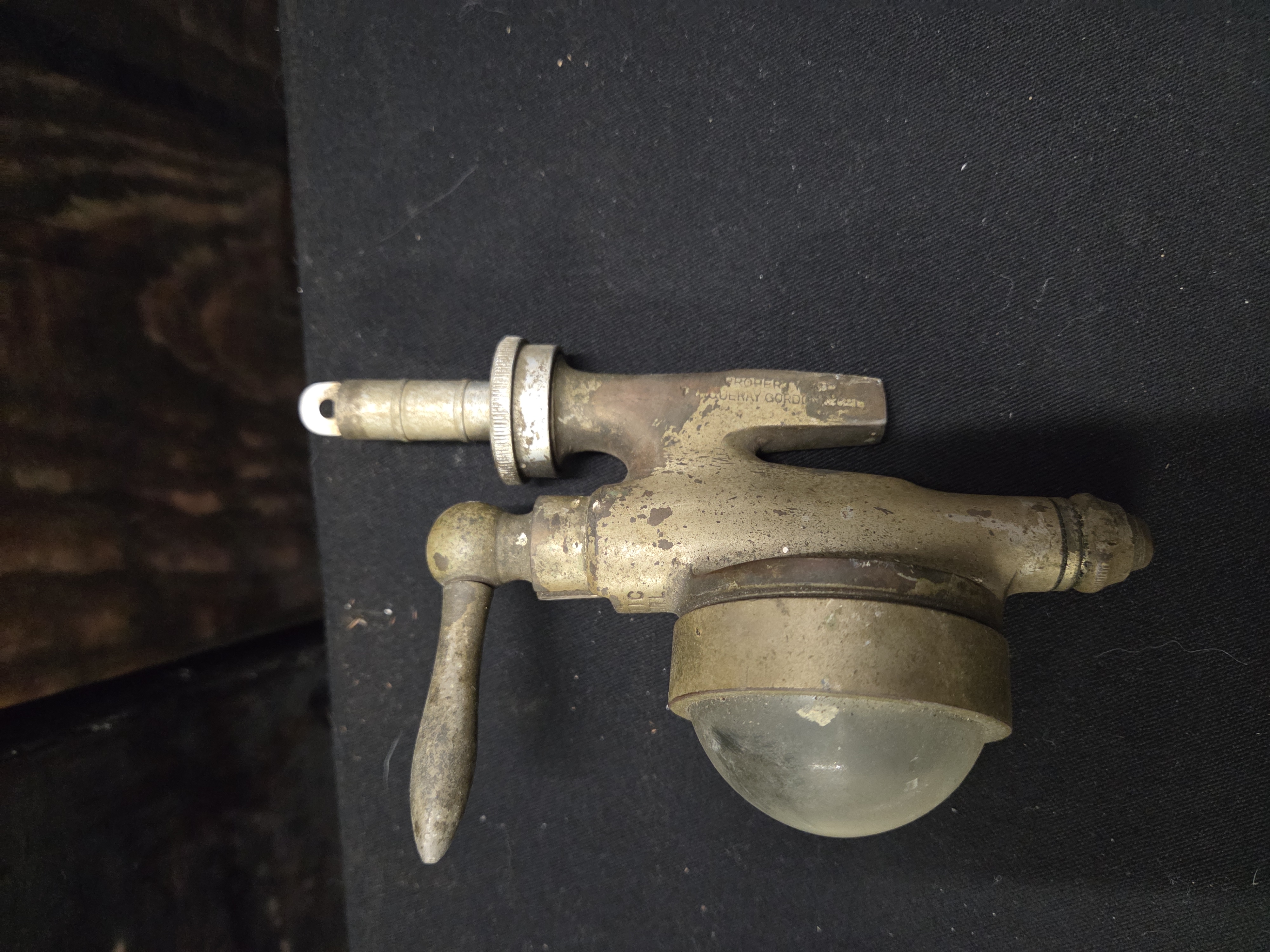A vintage brass-toned Gaskell and Chambers Optic Pearl spirit dispenser featuring a clear glass dome and stamped property marks for Duqueray Gordon.