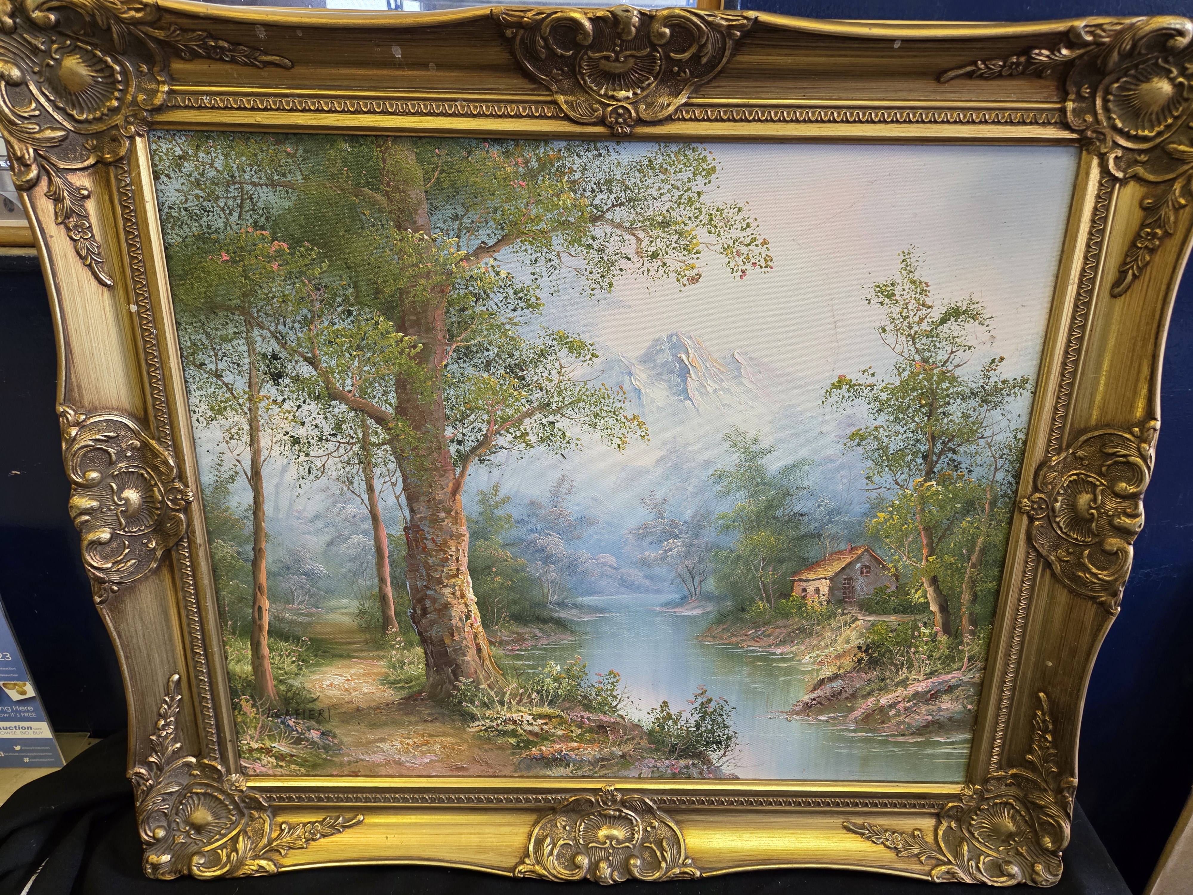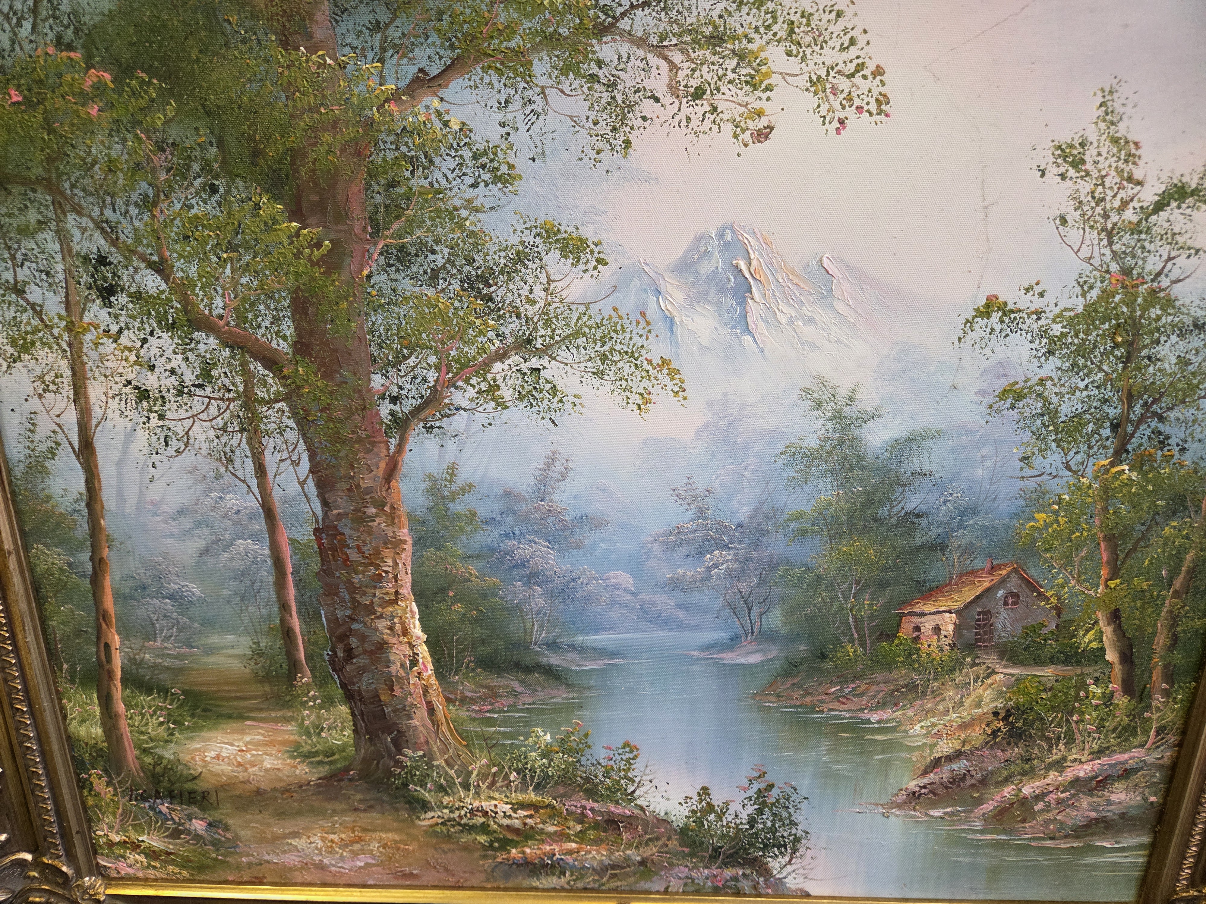 Lot 175 I. Cafieri, River Landscape with Cottage and Mountains, Oil on Canvas