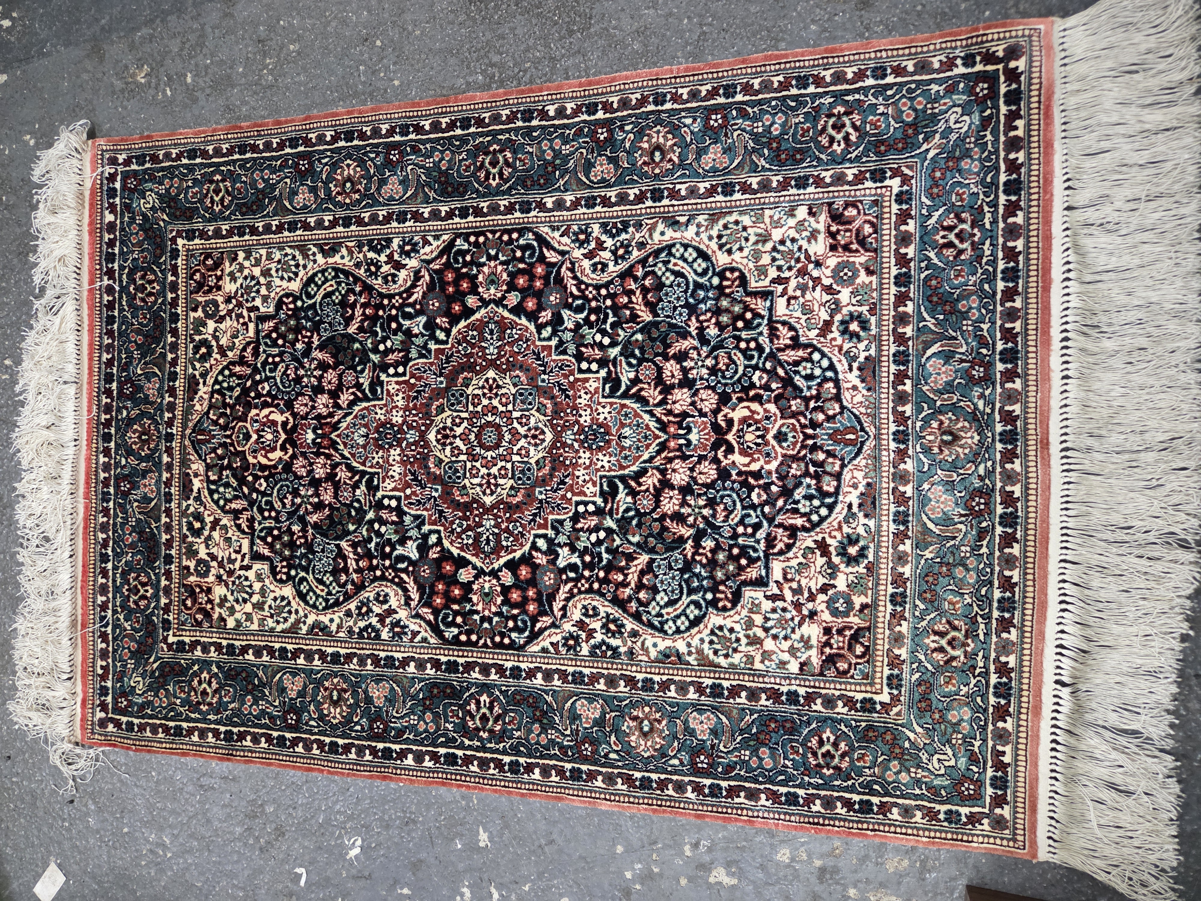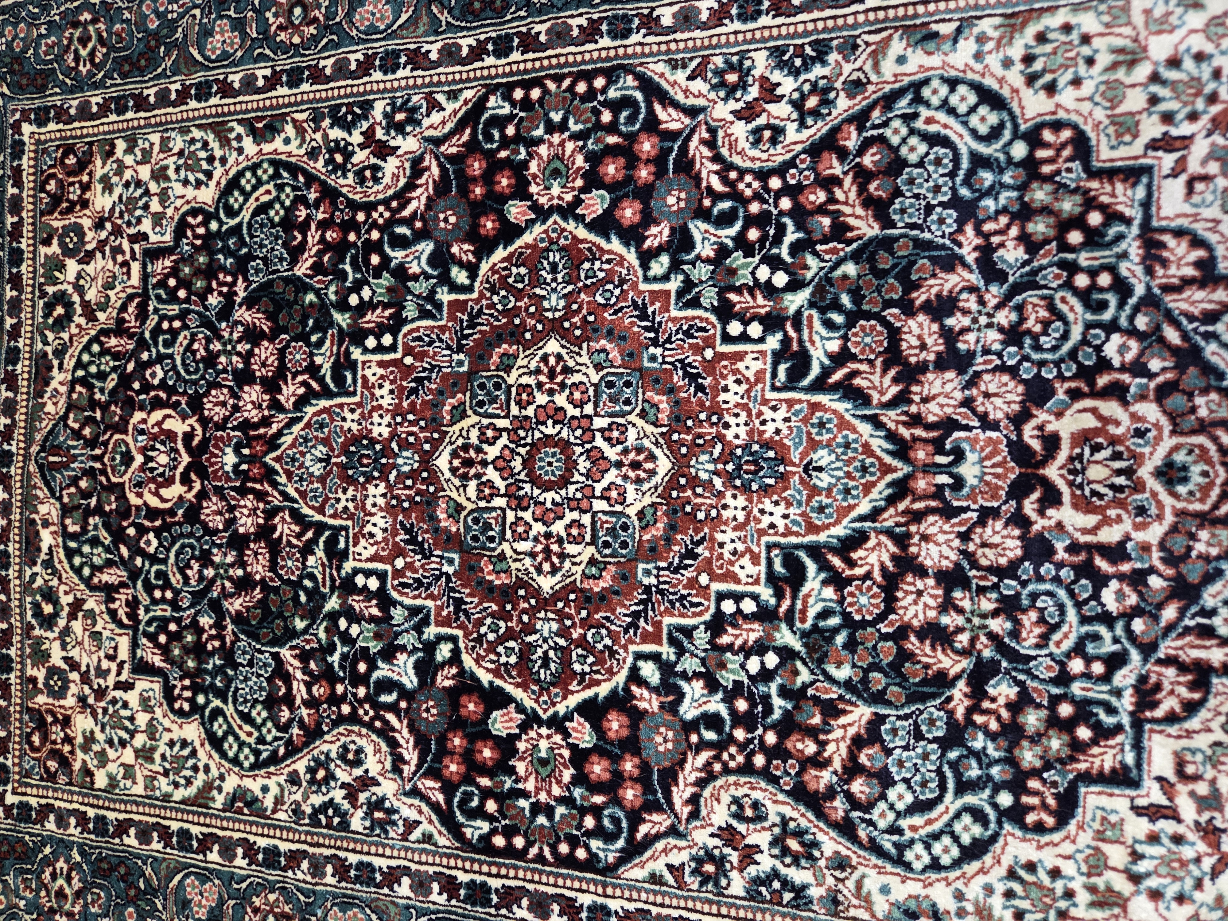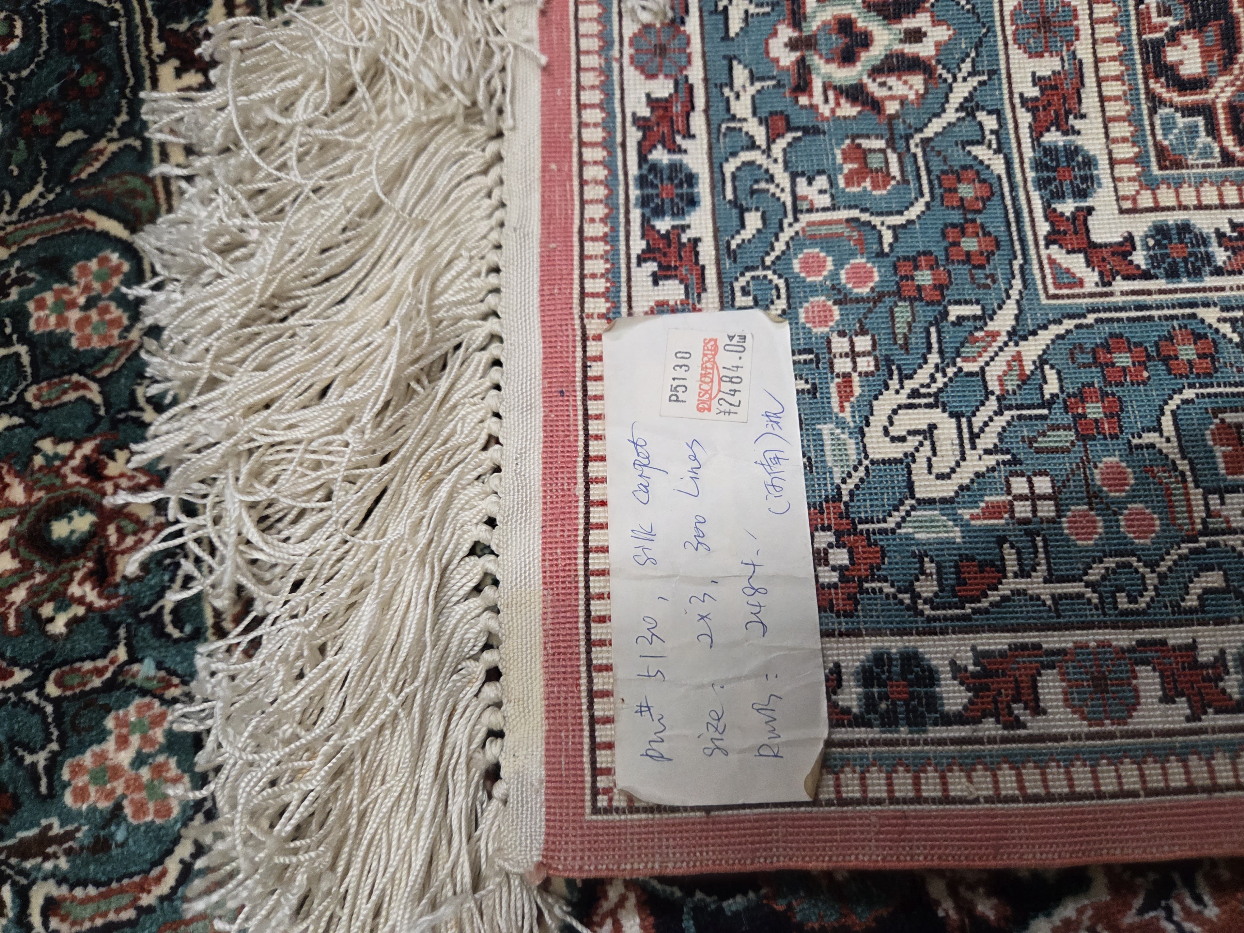 A multi-coloured silk carpet featuring intricate floral patterns in navy blue, red, and teal, measuring approximately 2 by 3 feet with 300 lines.