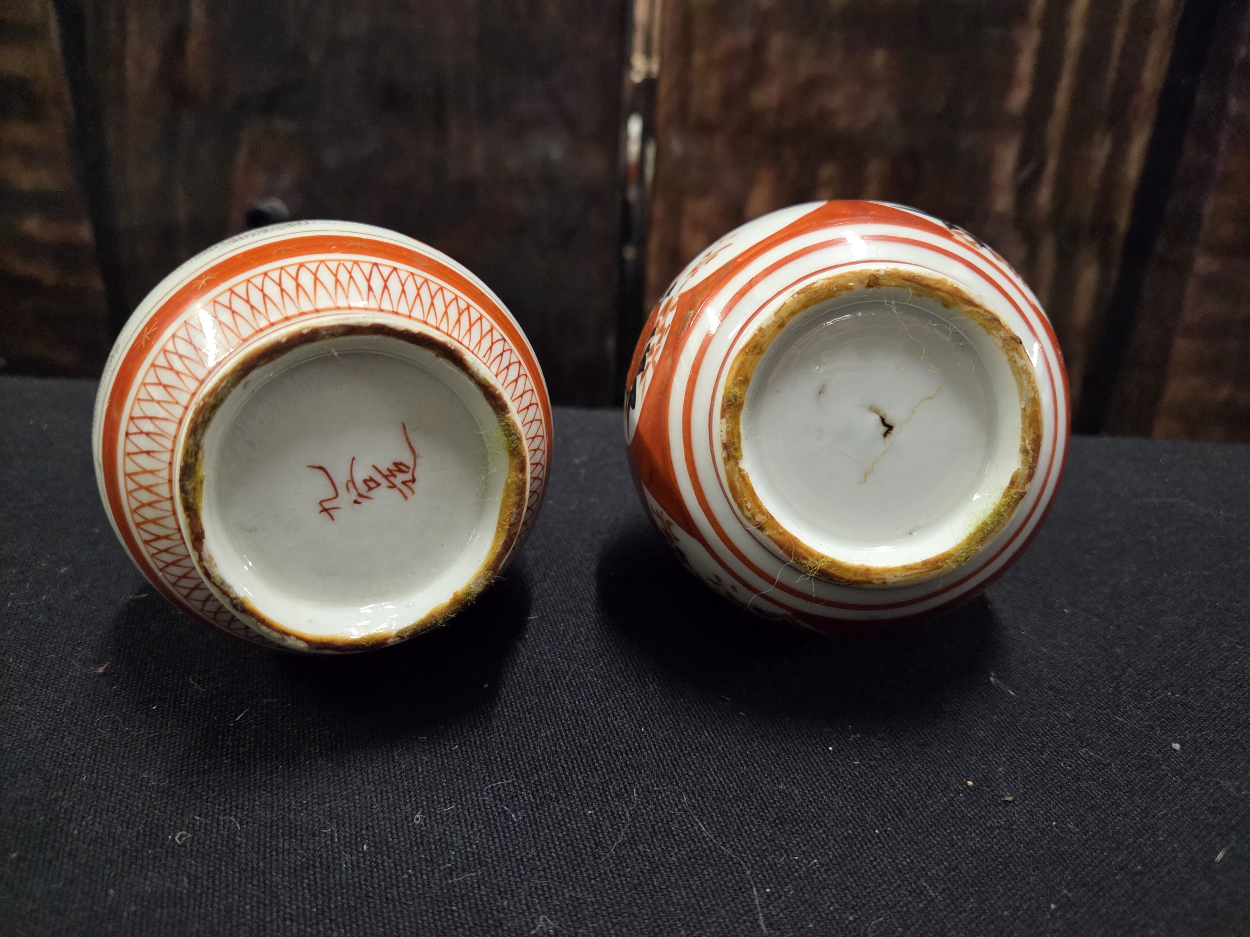 A pair of small ceramic bottle vases featuring orange, white, and black decorative patterns with gold-toned accents, one bearing a red hand-painted inscription to the base.