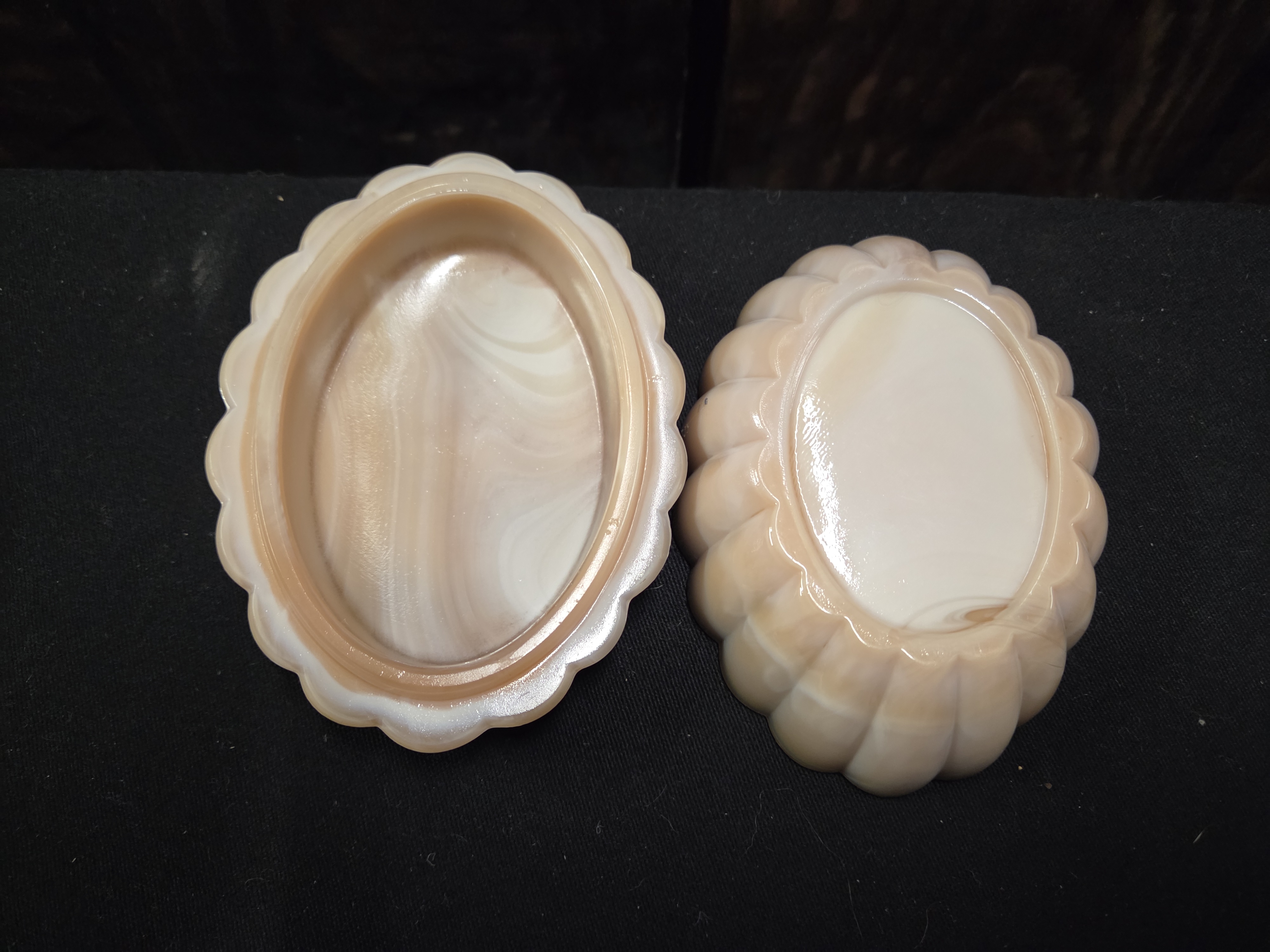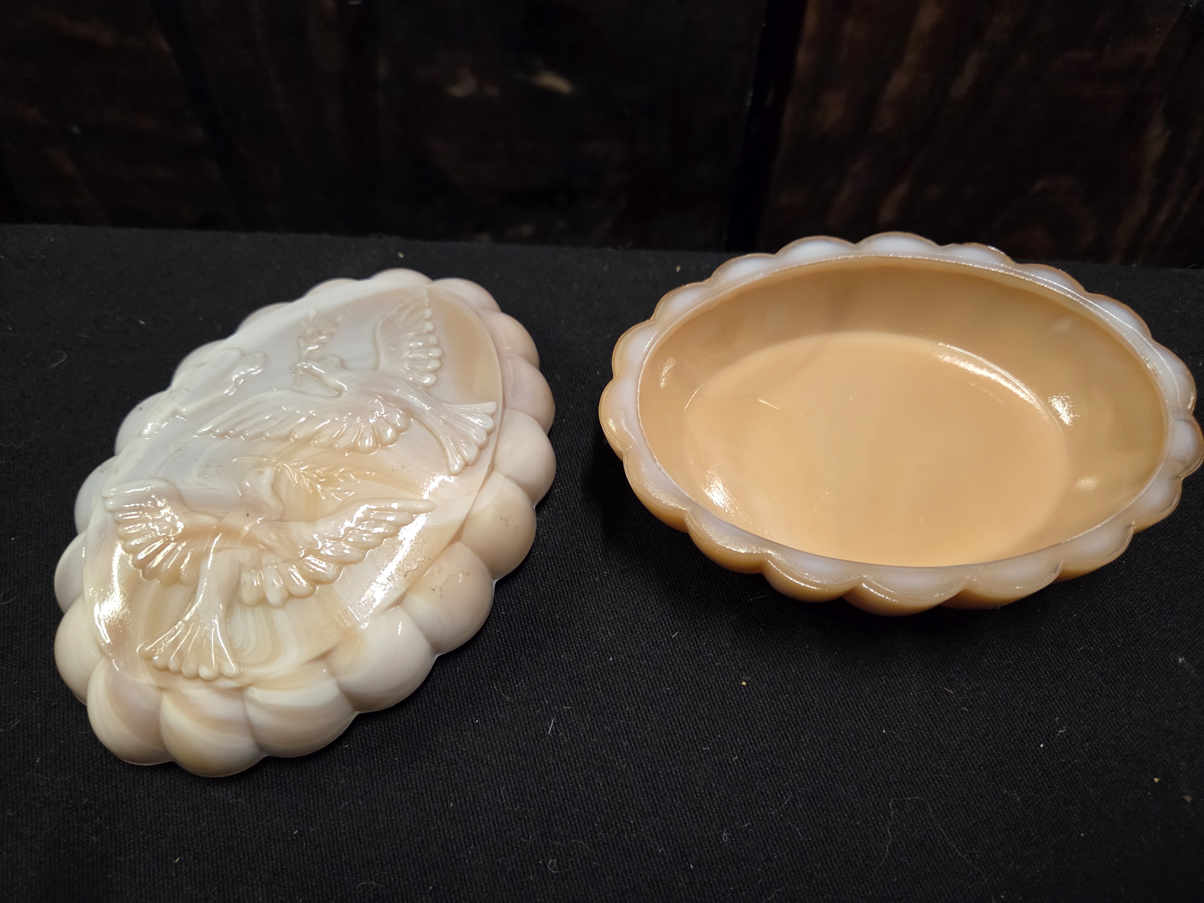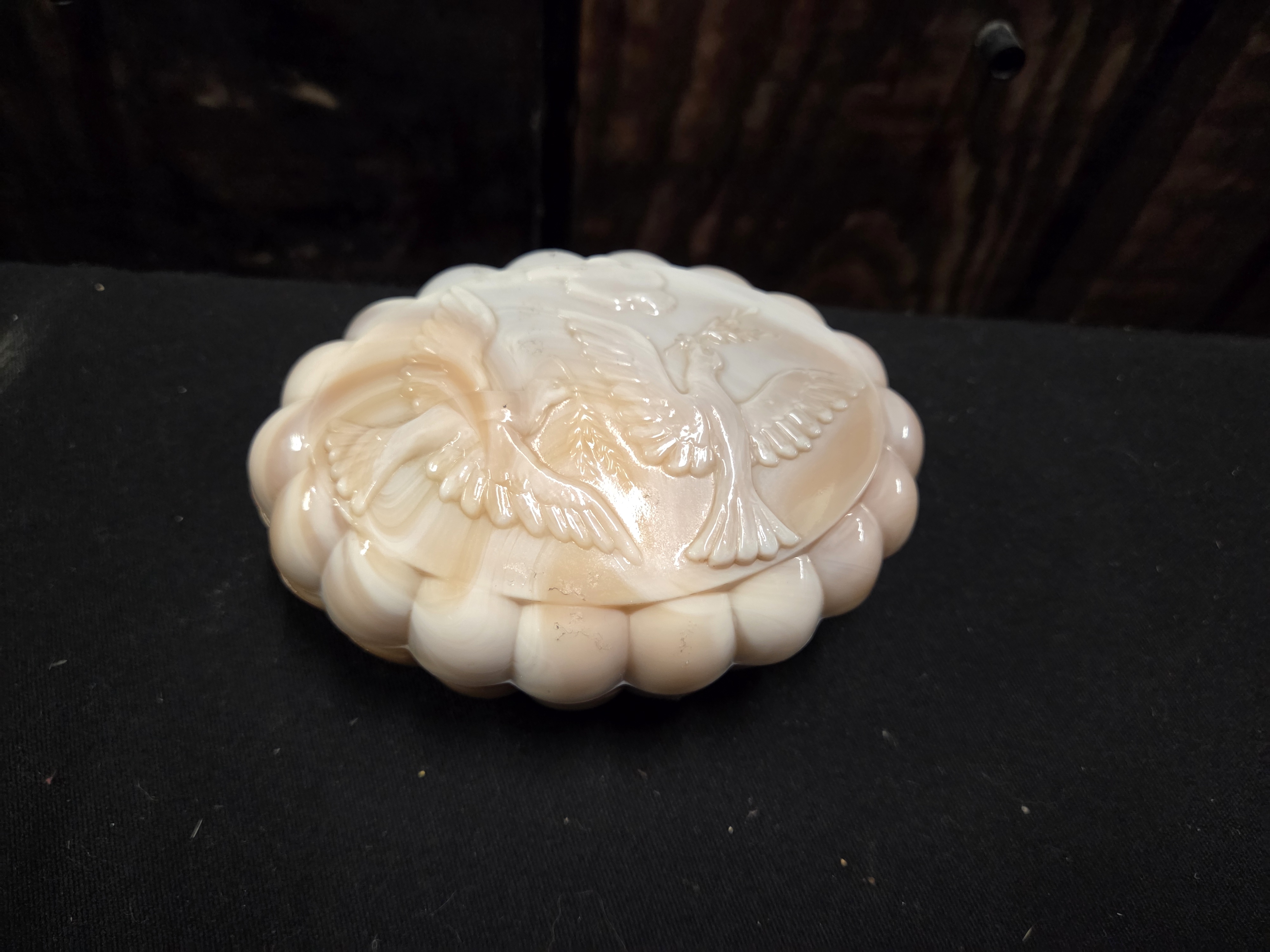 An oval, marbled peach and white slag glass trinket box featuring a scalloped edge and a lid with a relief-moulded scene of two birds.