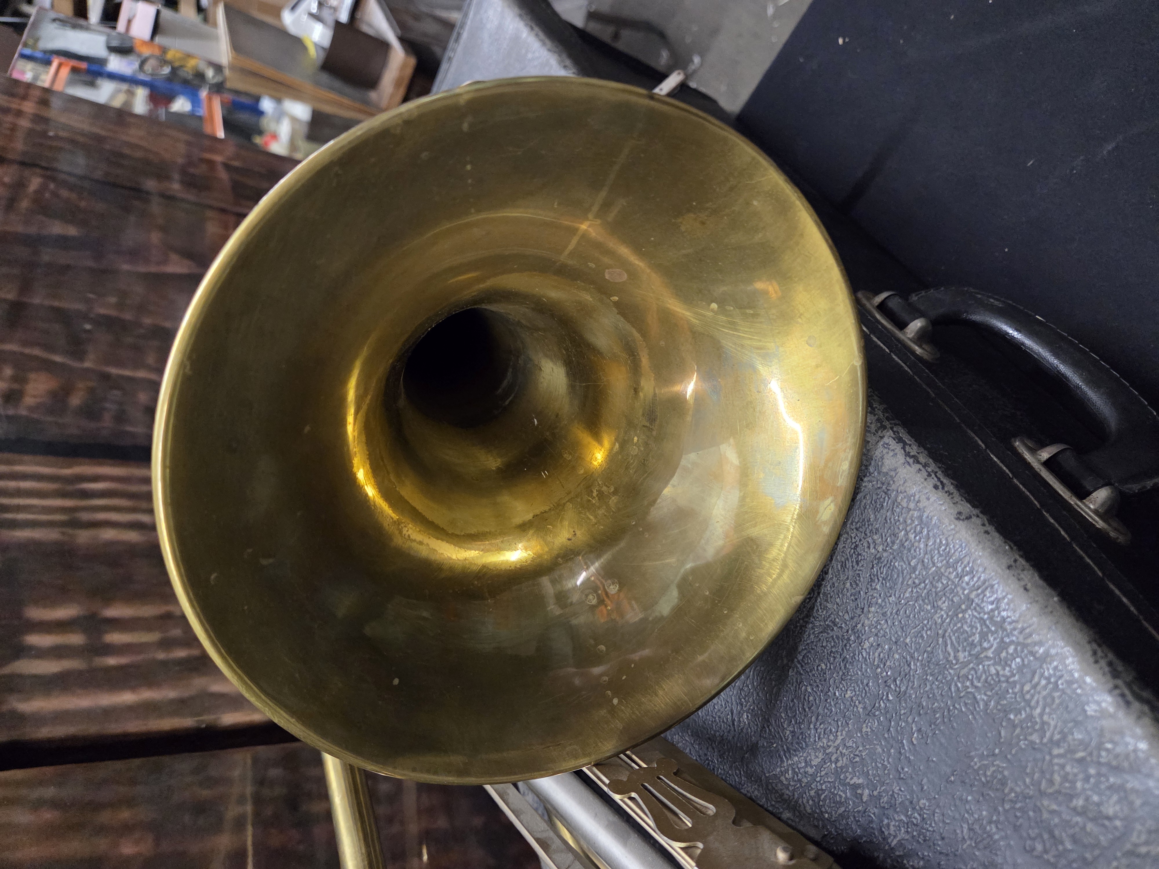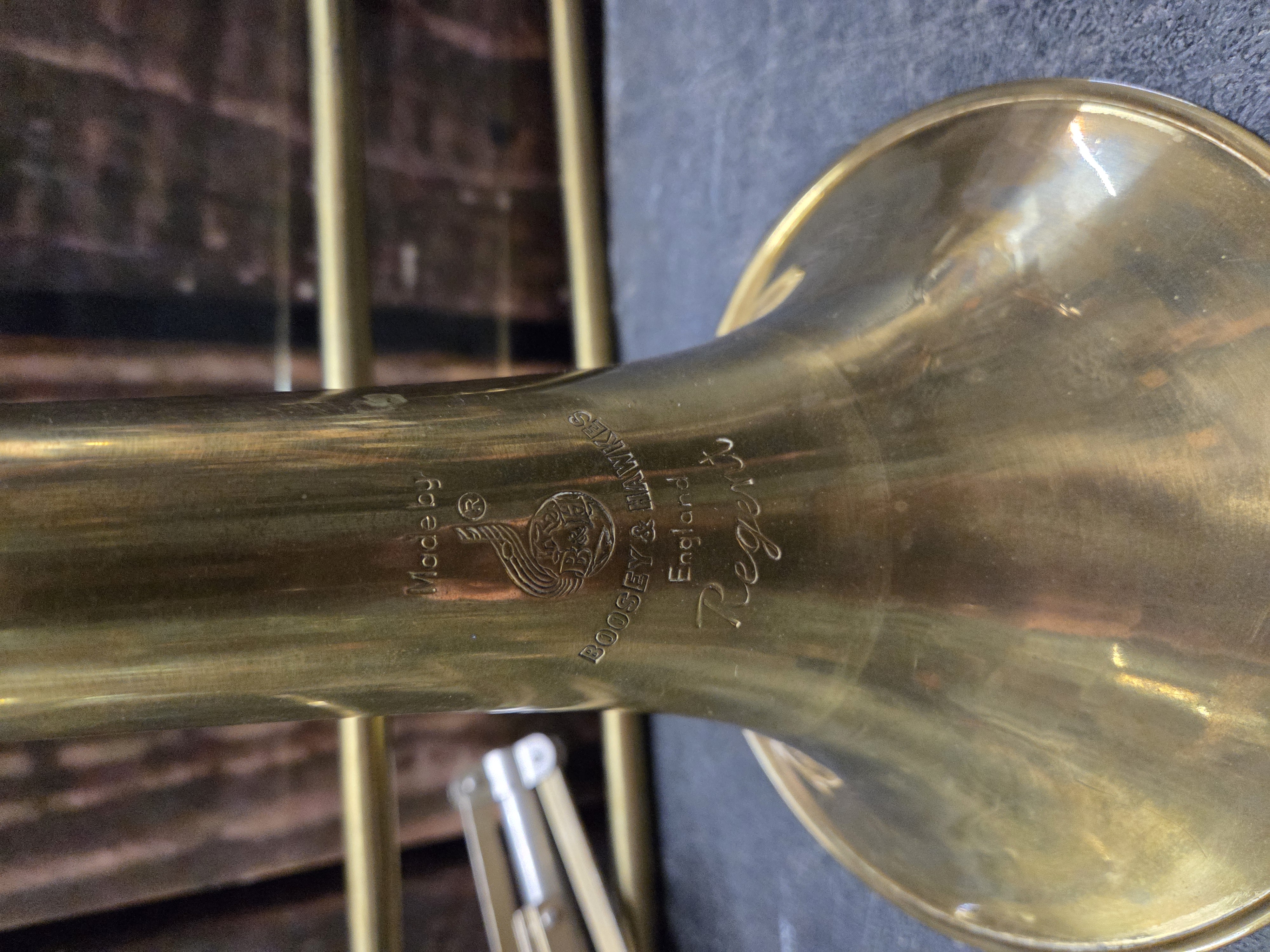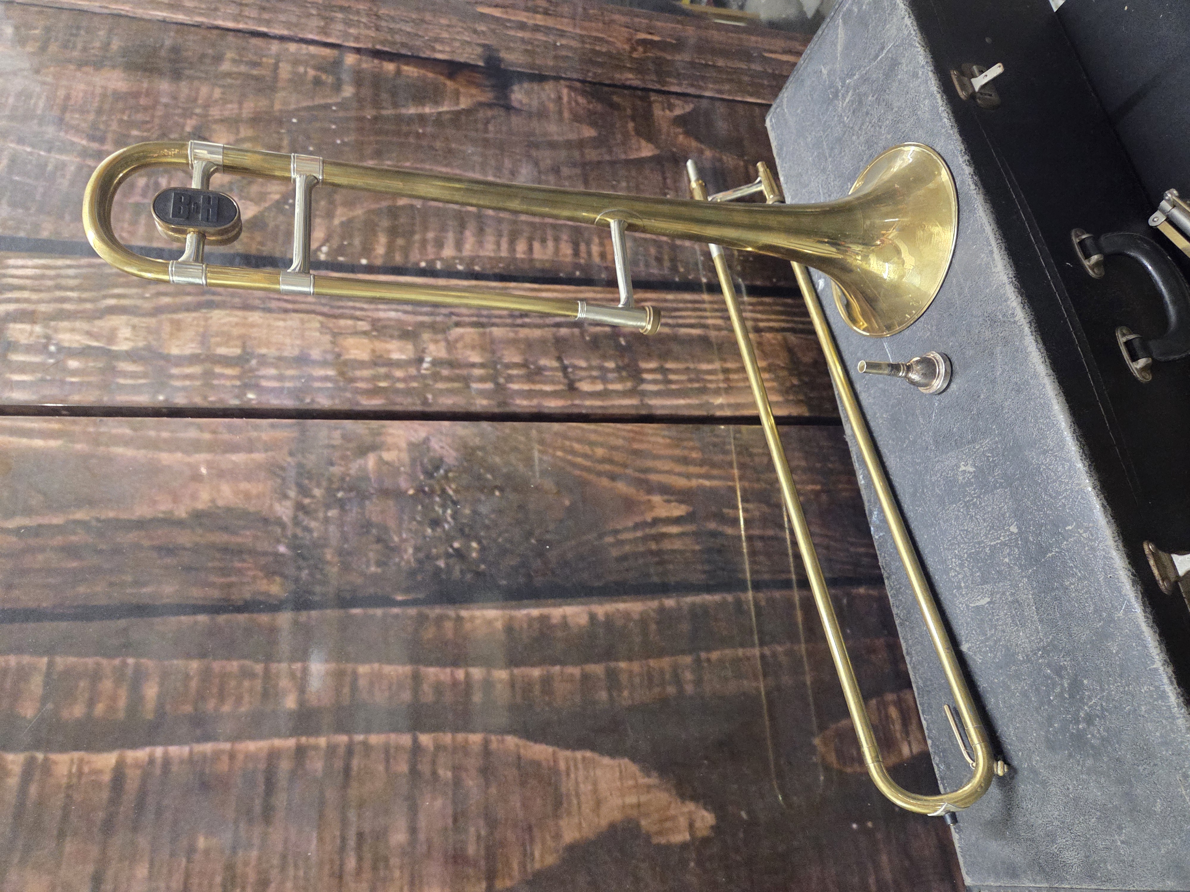 A brass Boosey & Hawkes Regent trombone made in England, featuring a silver-tone mouthpiece and housed in a black hardshell carrying case.