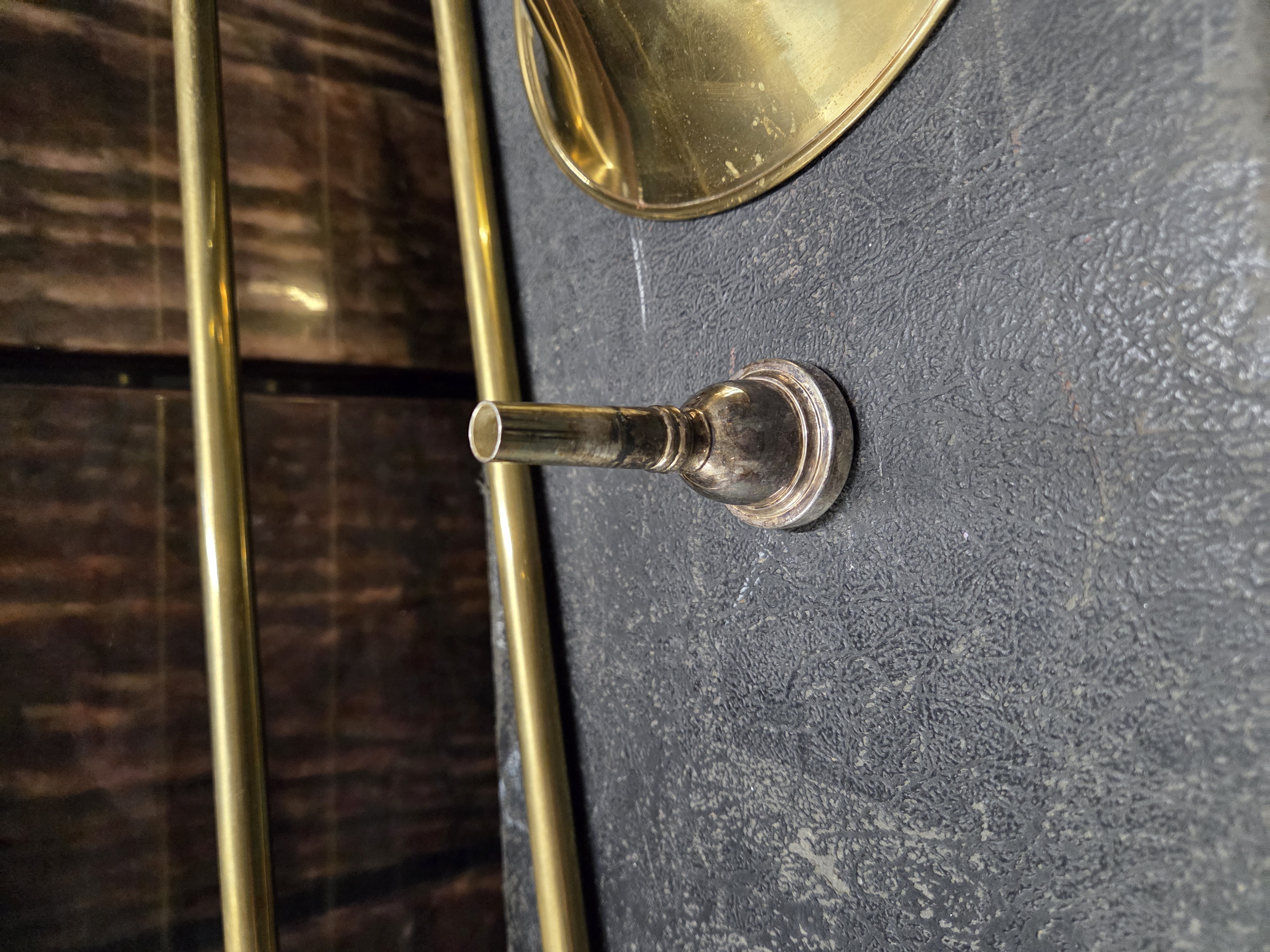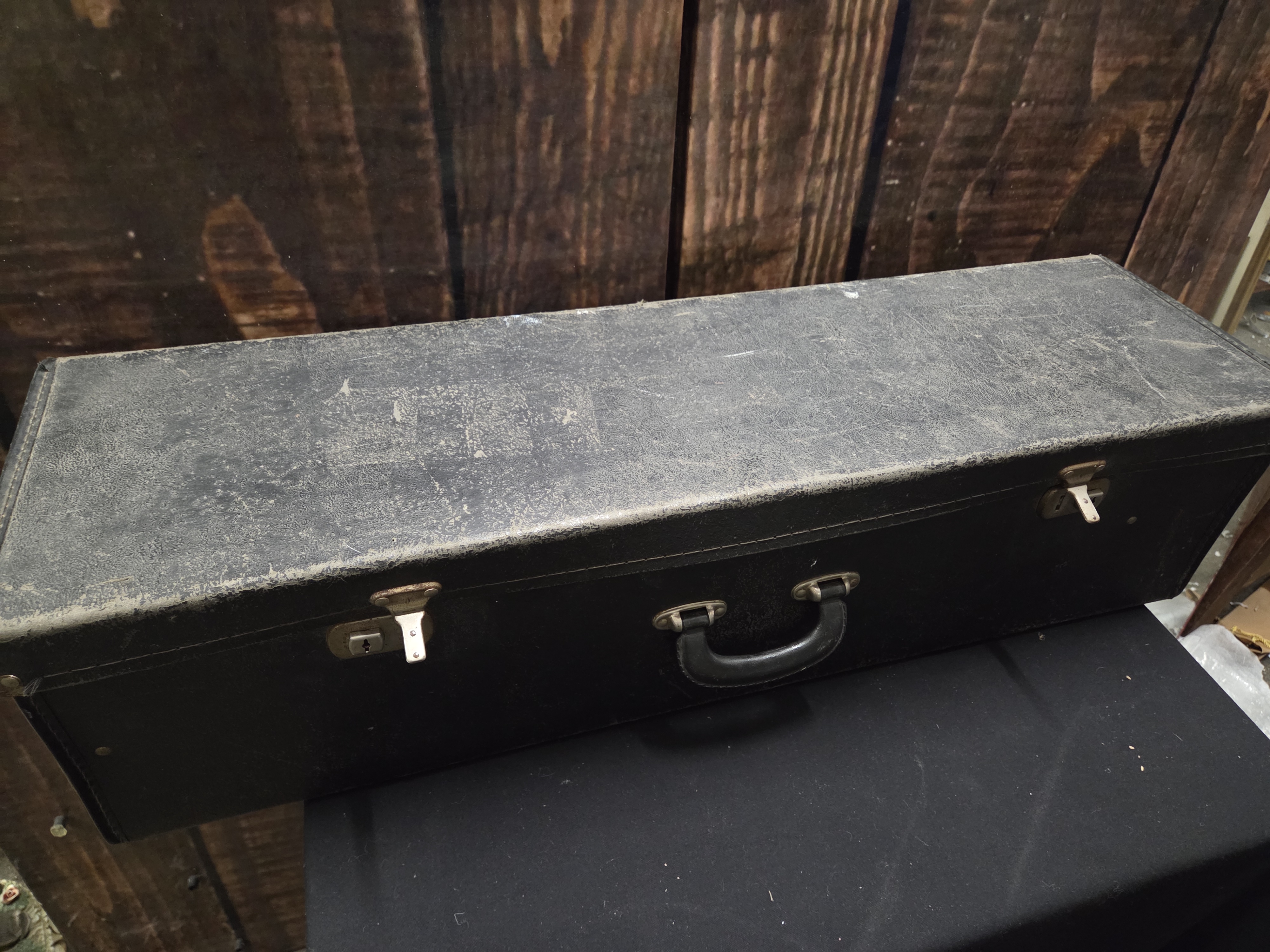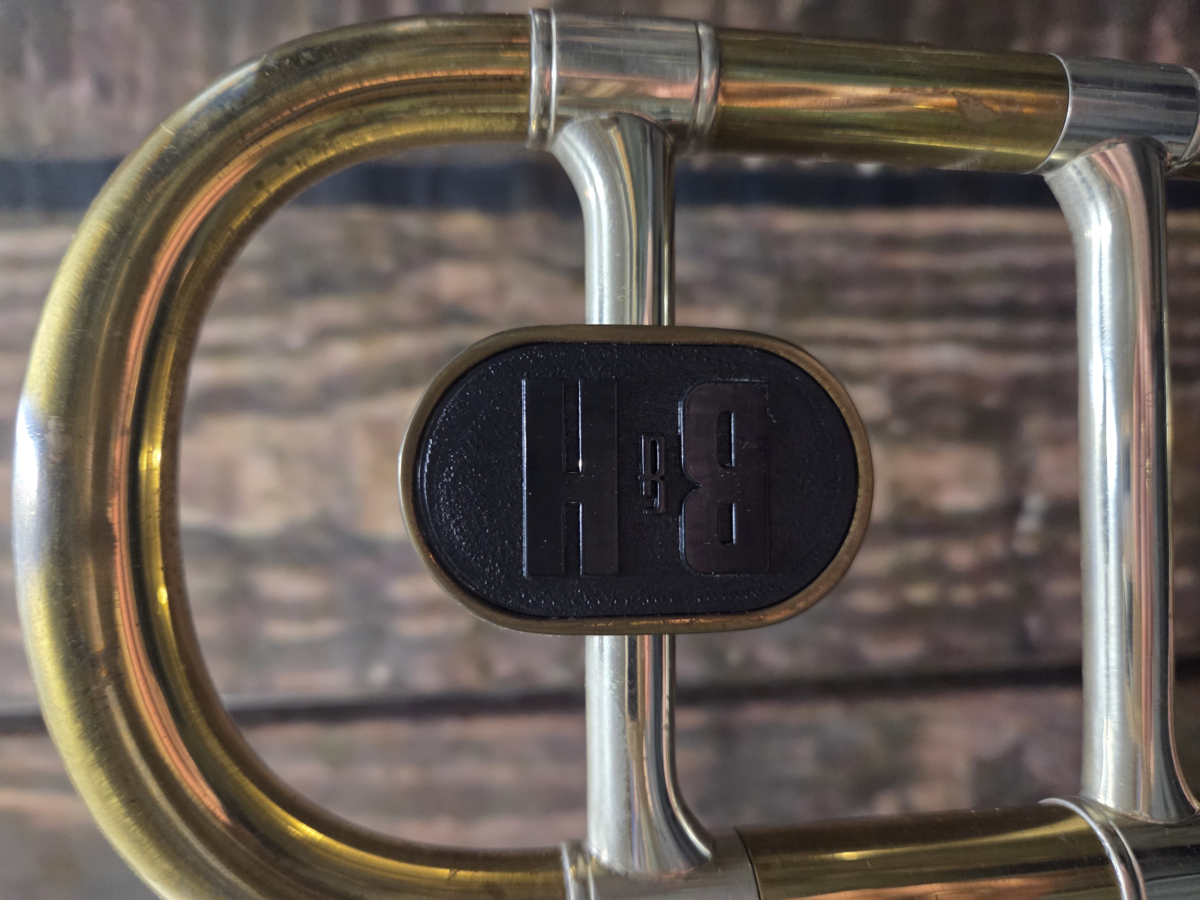 A brass Boosey & Hawkes Regent trombone made in England, featuring a silver-tone mouthpiece and housed in a black hardshell carrying case.