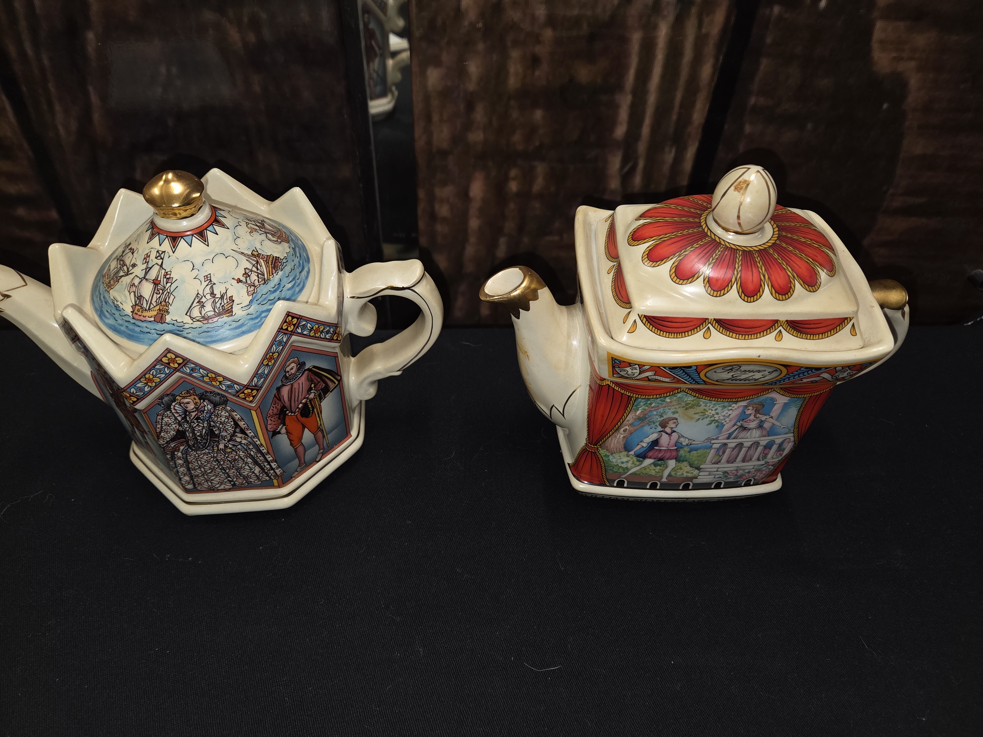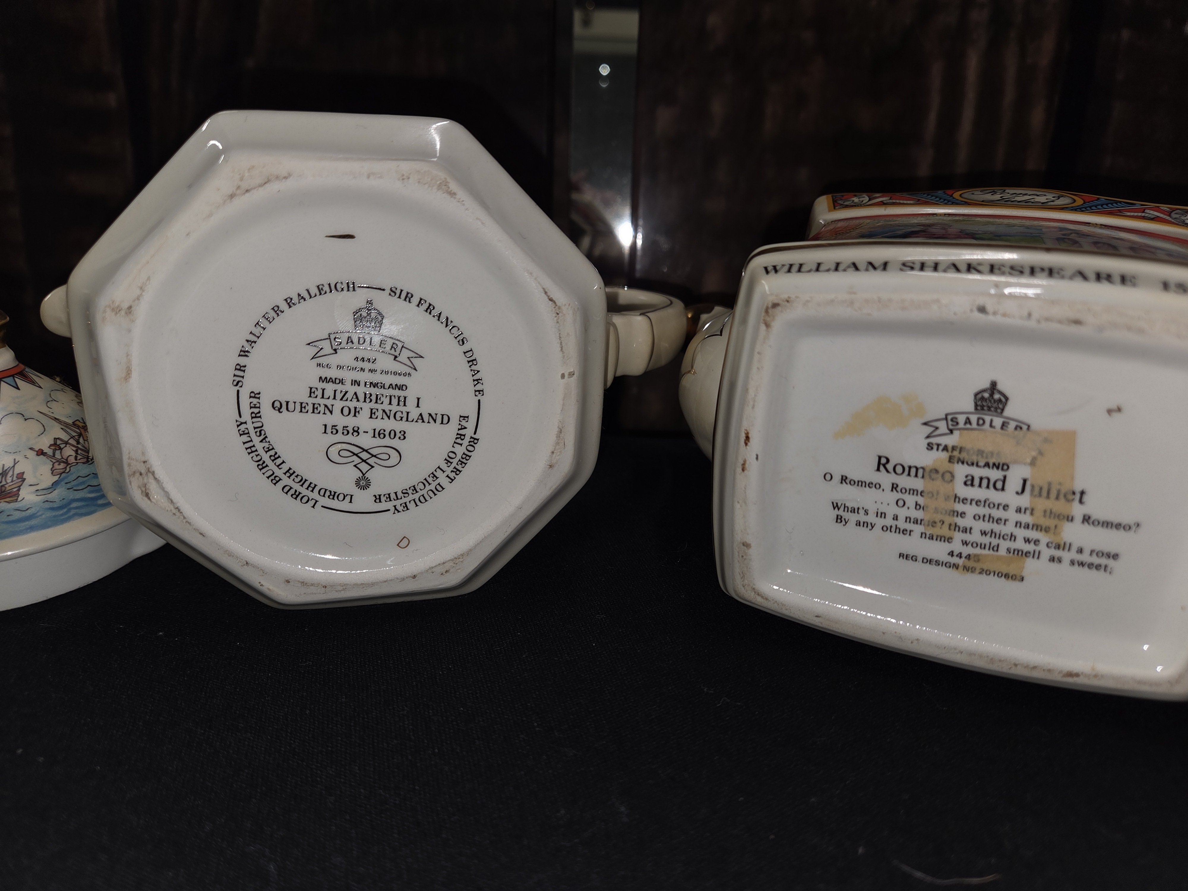 Two cream-coloured ceramic teapots with lids, one featuring Queen Elizabeth I and the Spanish Armada and the other depicting Shakespeare’s Romeo and Juliet with gilt accents.