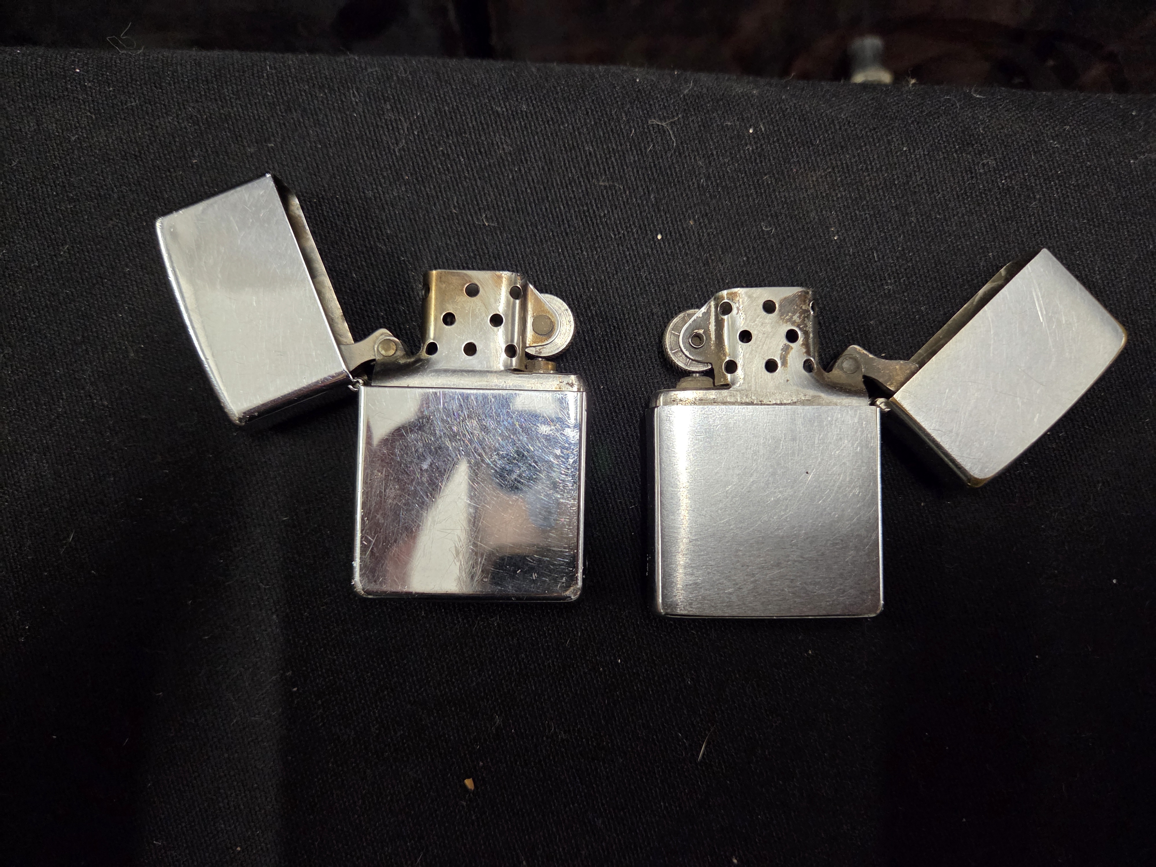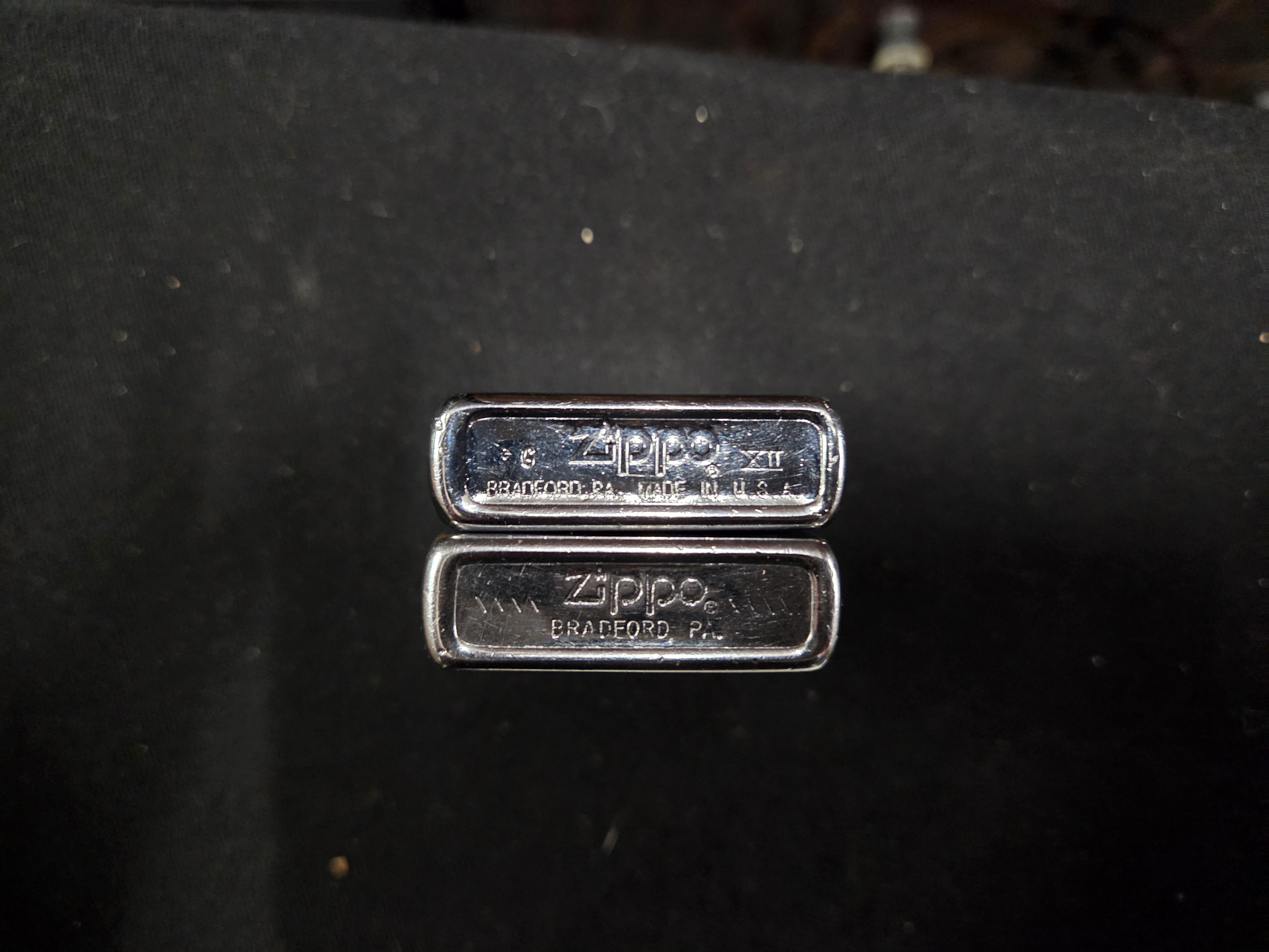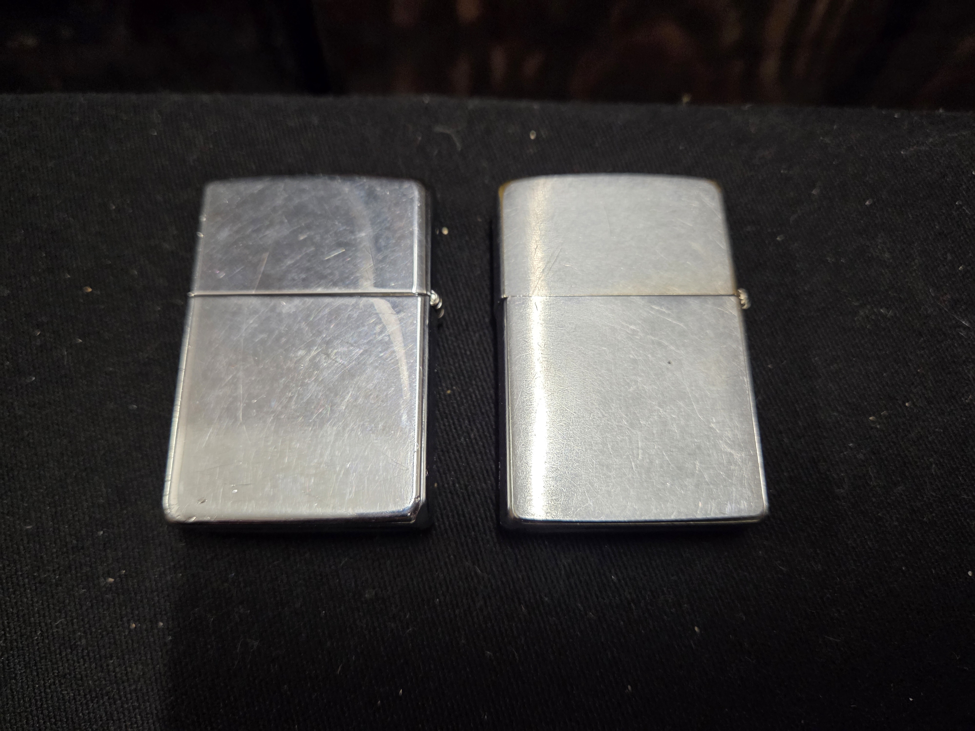 A pair of silver-toned metal pocket lighters featuring brushed and polished chrome finishes, both marked with the Zippo brand name and Bradford, PA on the bases.