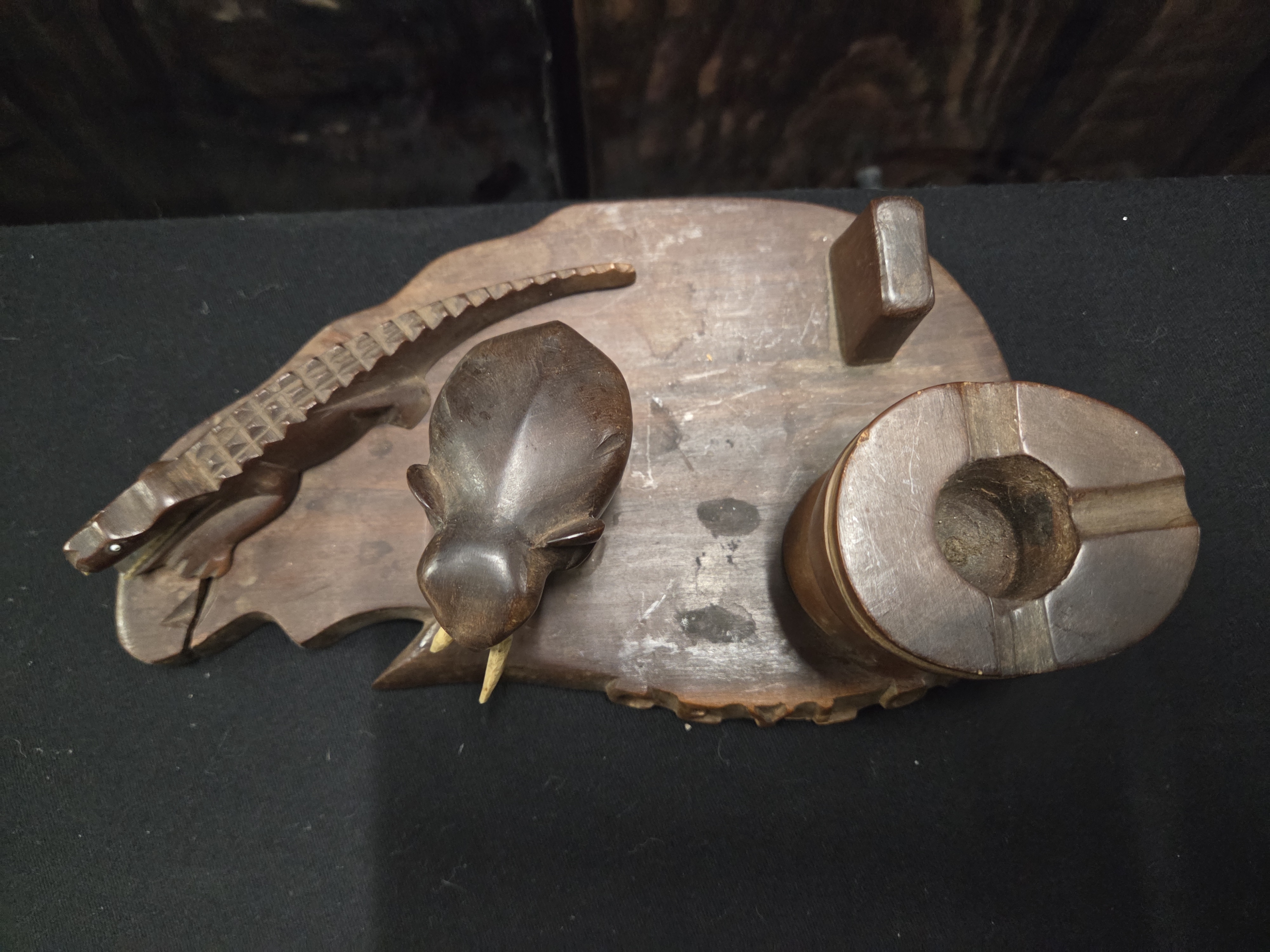 A dark brown wooden souvenir carving featuring an elephant and crocodile on a Sri Lanka shaped base with an integral ashtray and match holder.