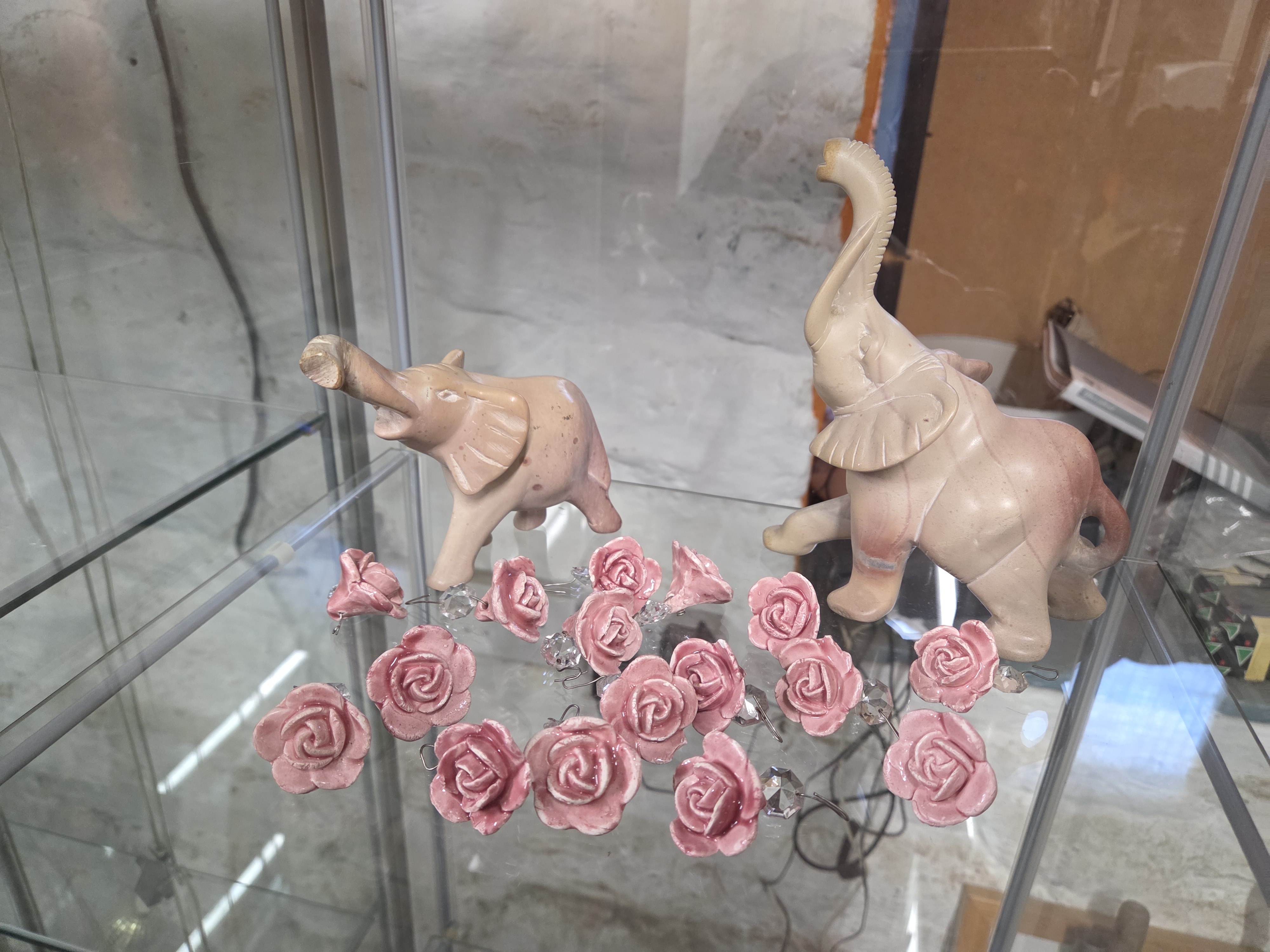 Lot 622 A Group of Decorative Items Comprising Two Carved Stone Elephants and Ceramic Rose Ornaments
