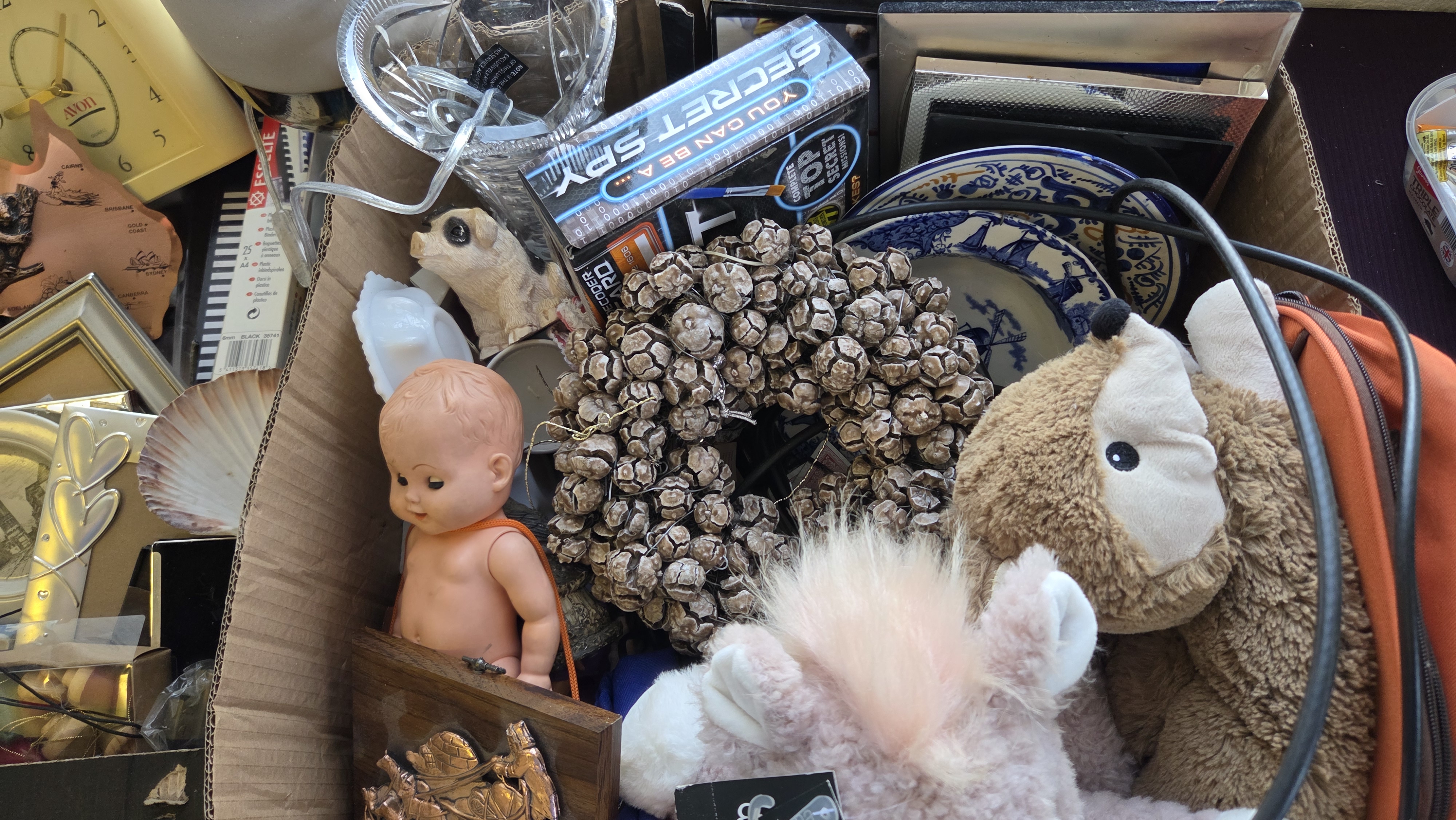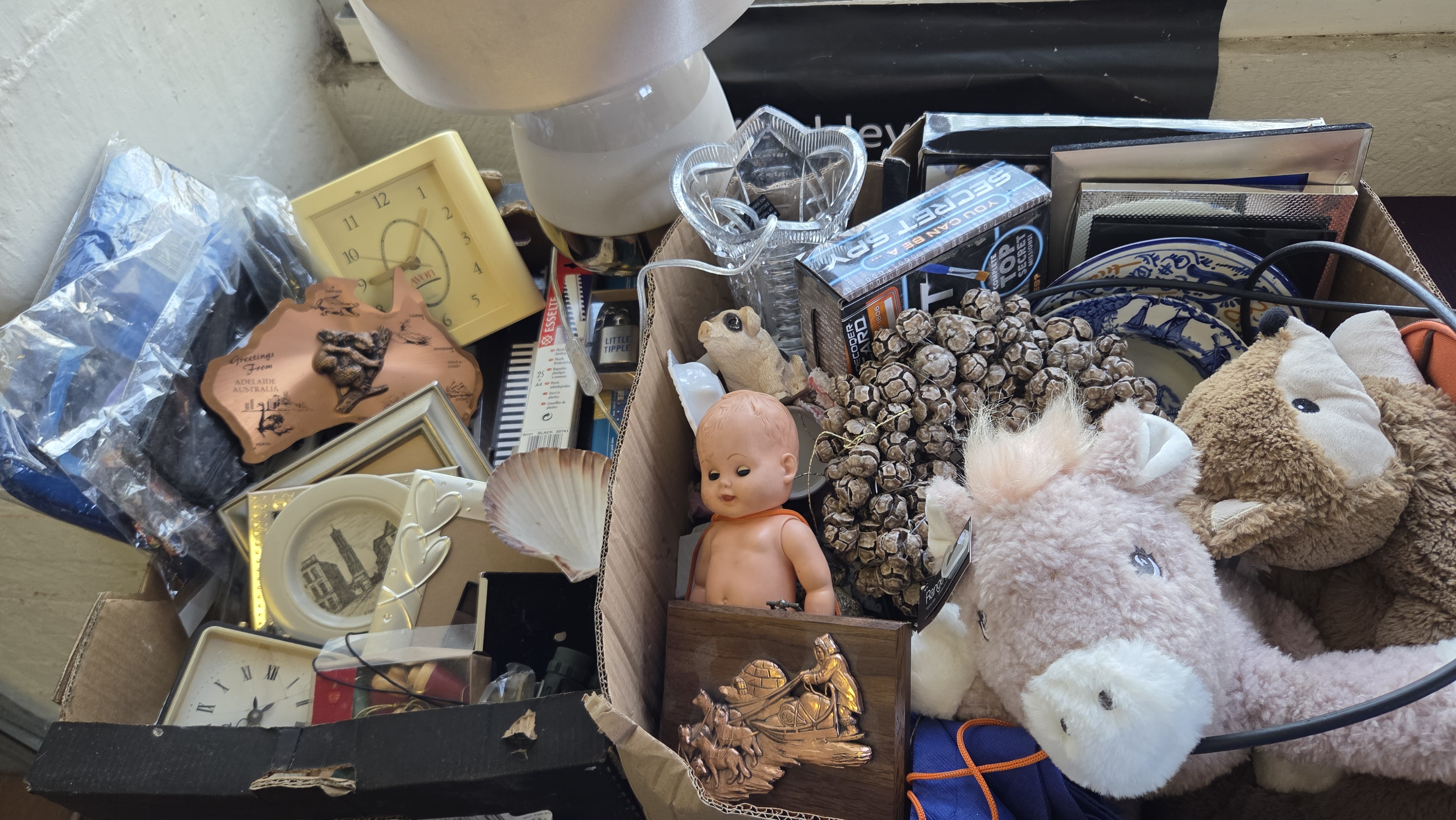 Lot 122 Two Boxes of Household Collectables, Toys, and Decorative Items including Avon and Esselte