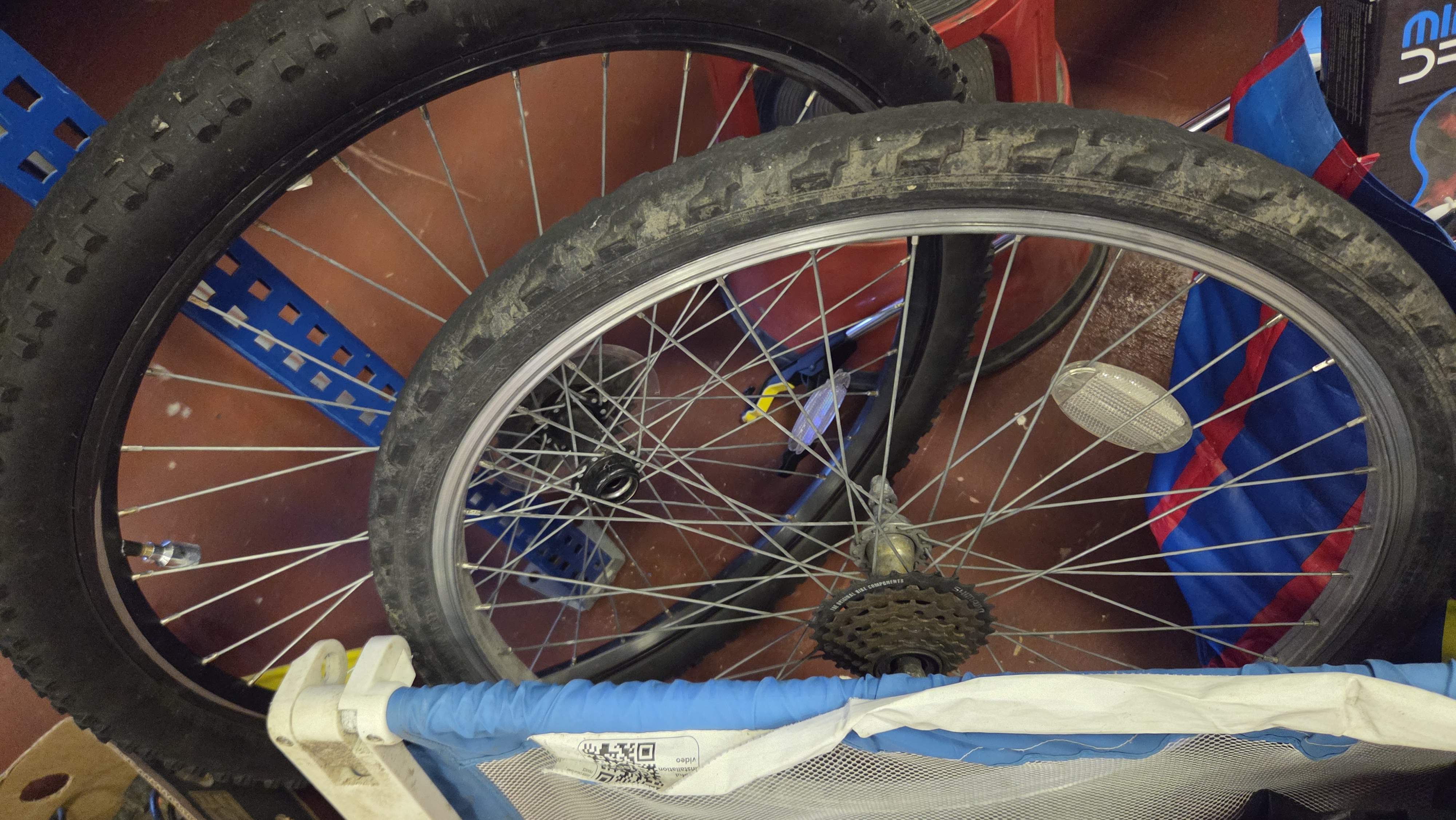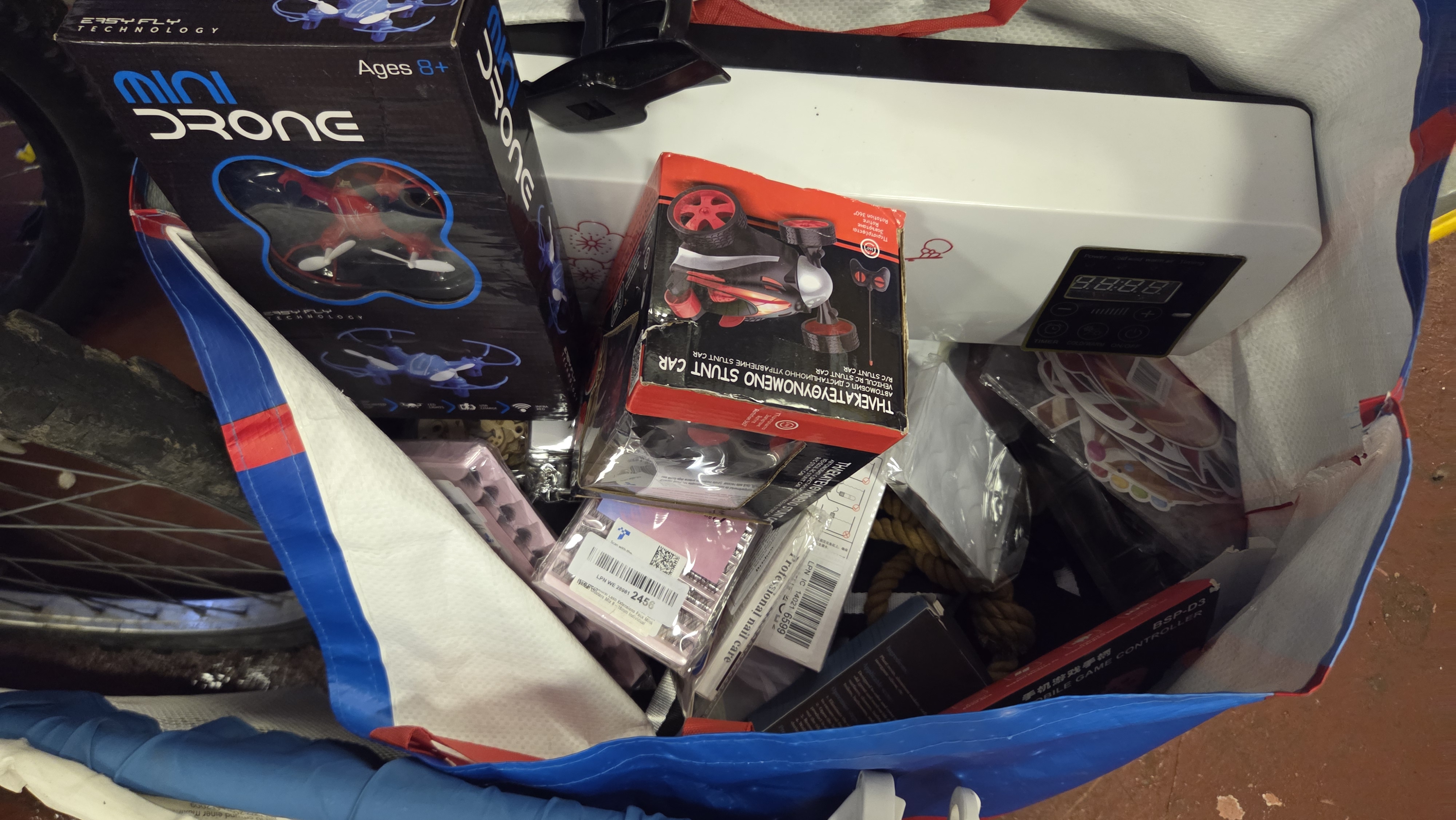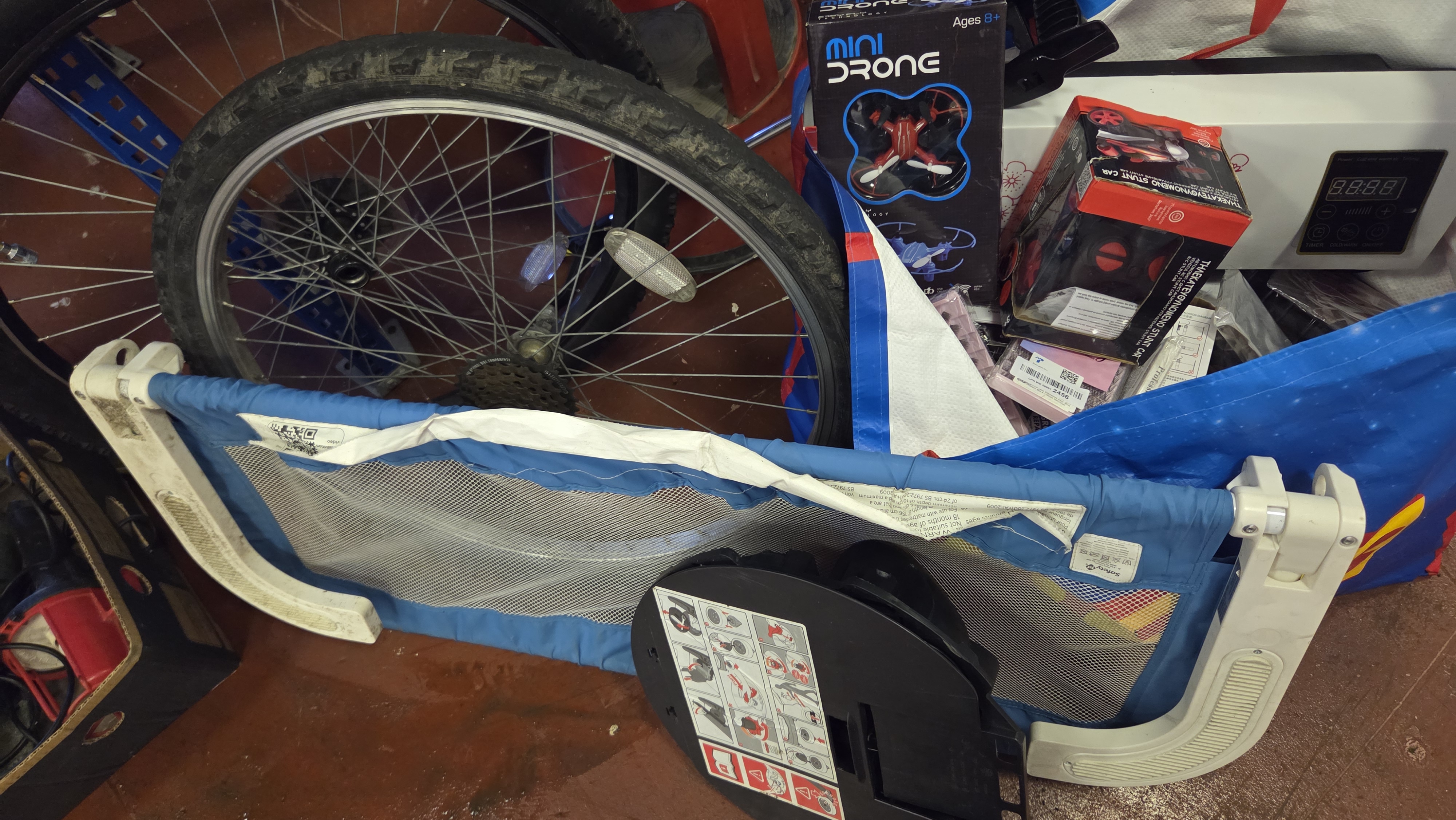 Lot 129 An Assortment of Mixed Consumer Goods Including Safety 1st Bed Rail, Shimano Bicycle Wheels, and Toys