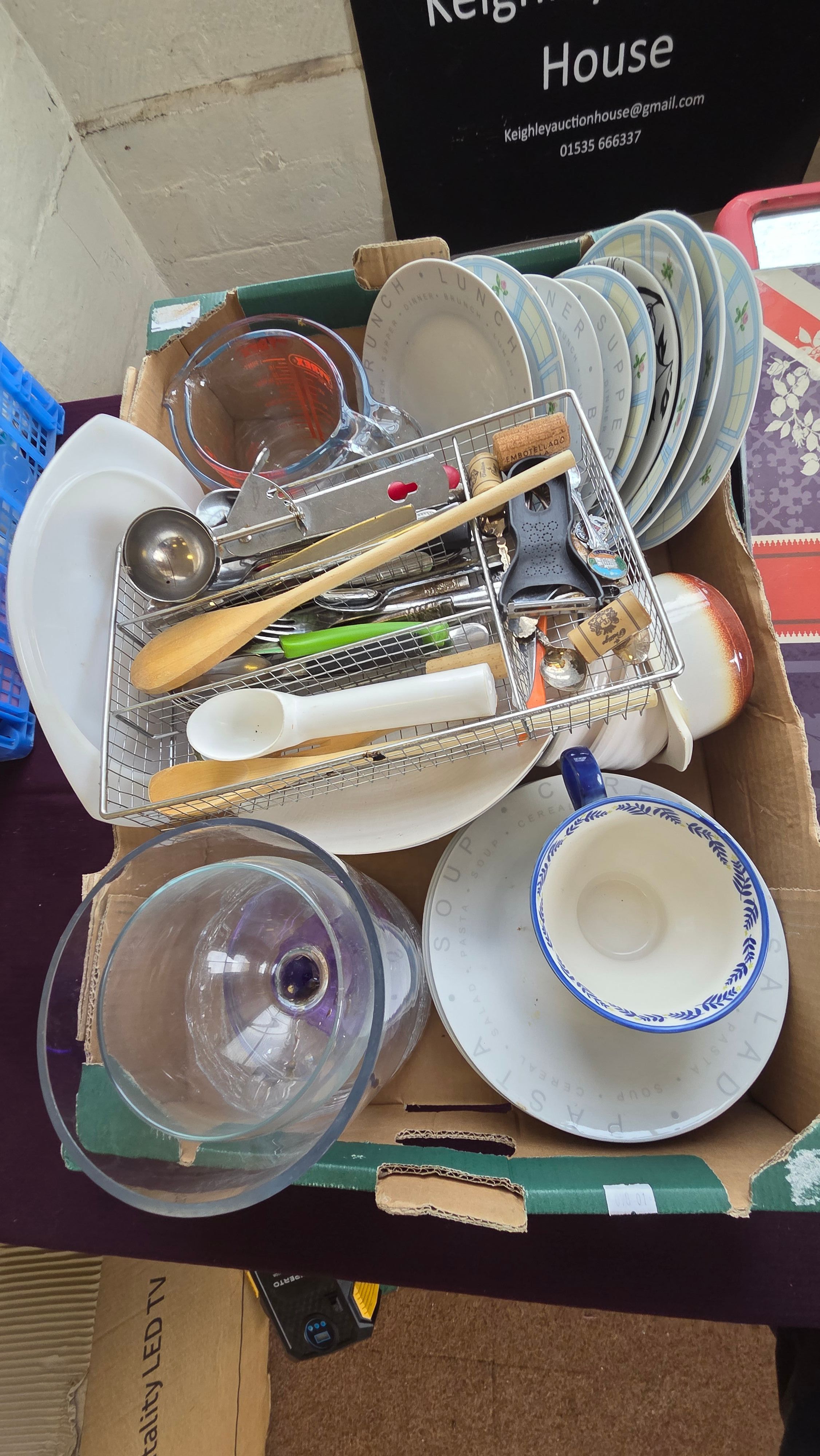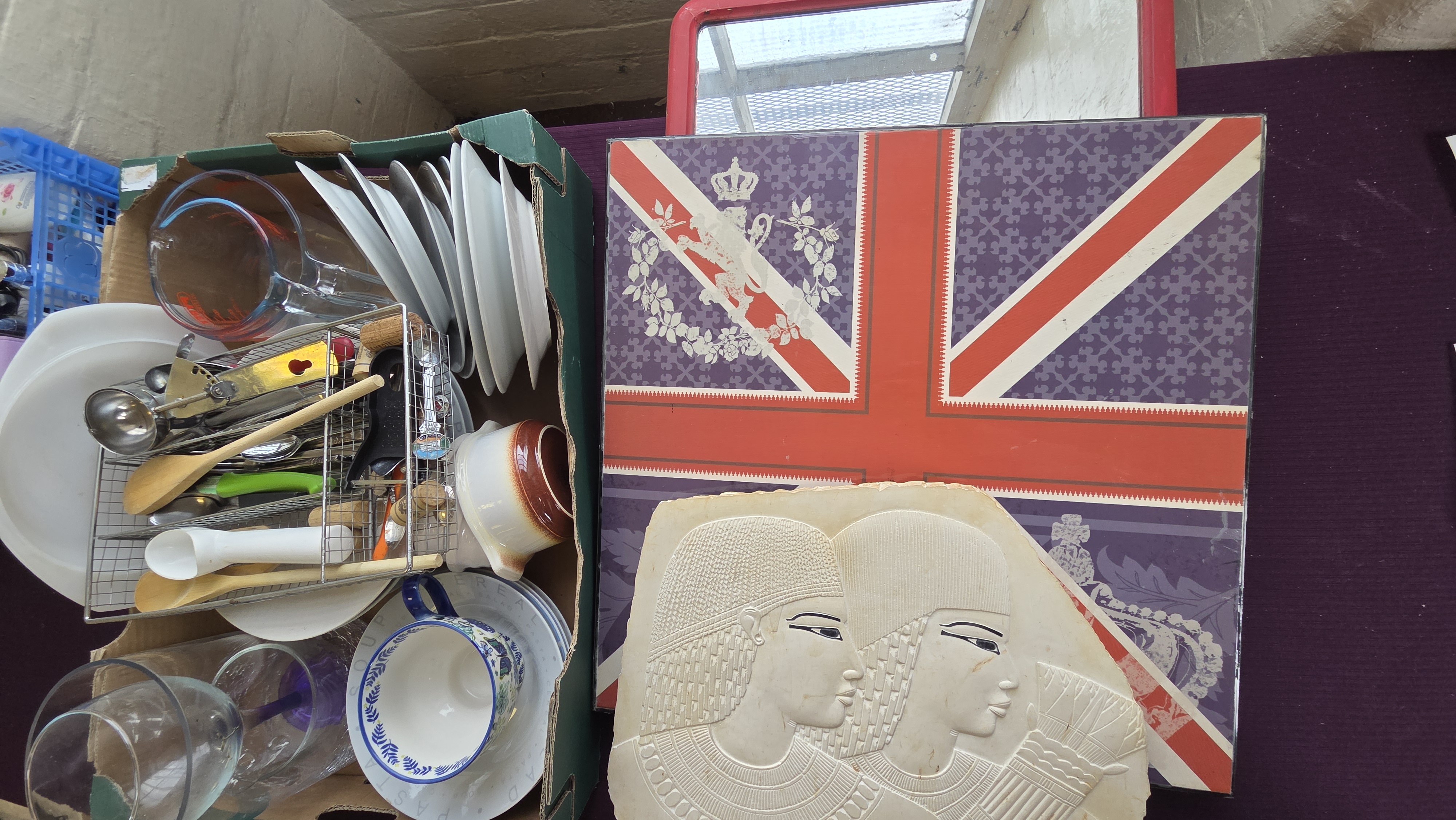 Lot 236 A Box of household kitchenware and decorative wall art including a Union Jack panel and Egyptian style relief