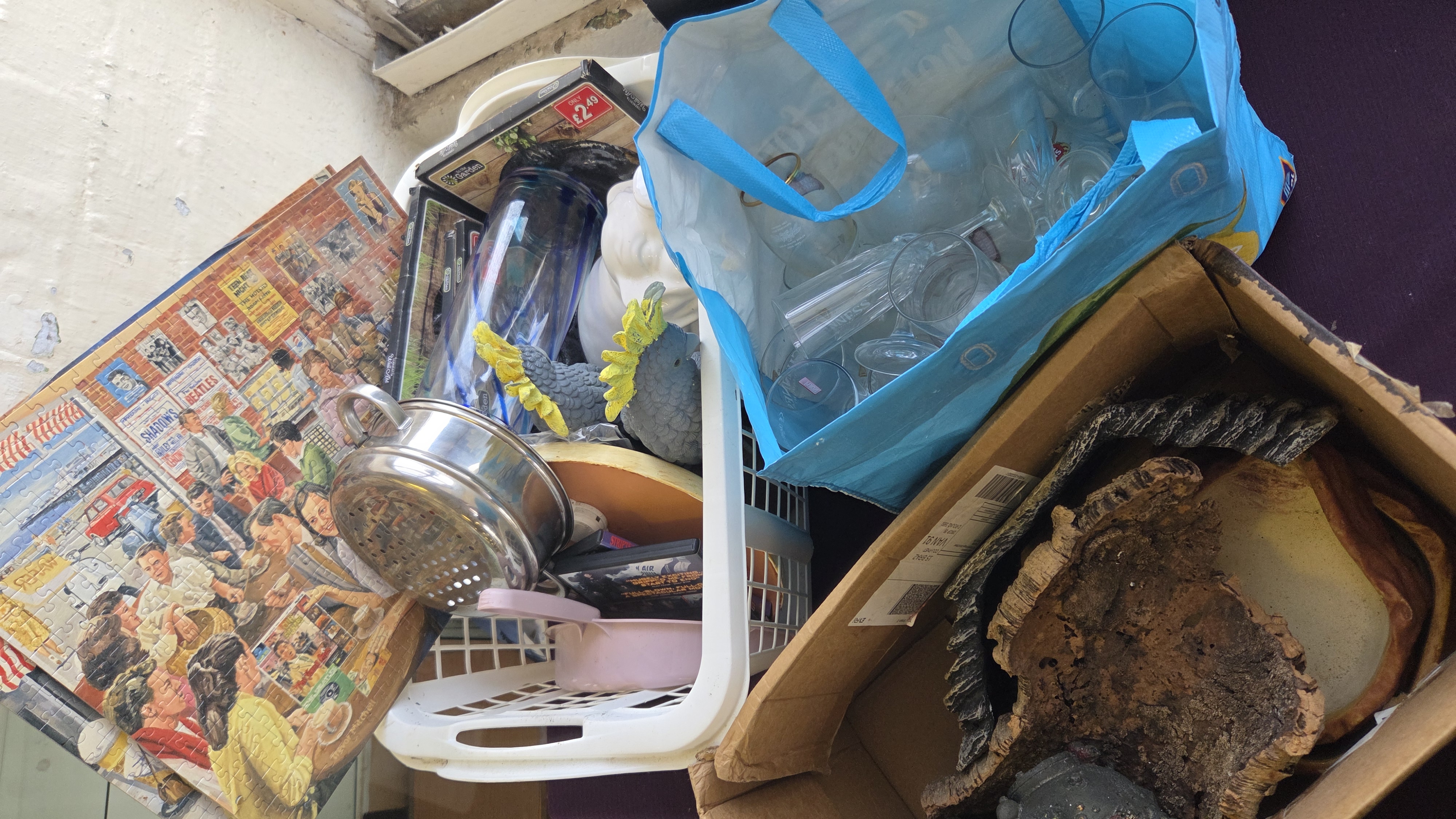 Lot 289 Basket, Box and Bag of Decorative Objects Glassware and Household Goods including a Large Wall Clock and Cockatoo Figurines