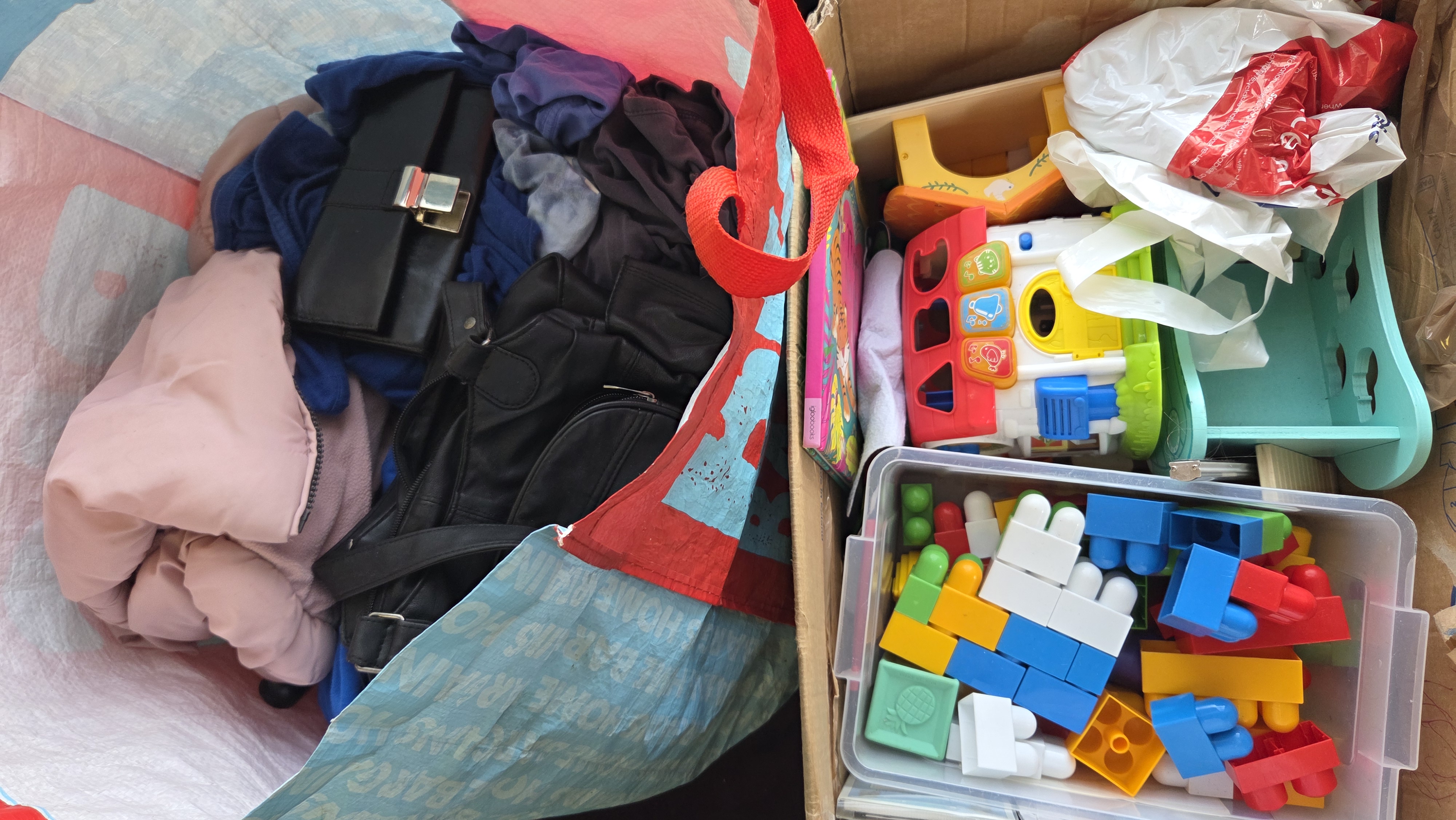Lot 290 Box and Bag of Children's Toys, Clothing, and Fashion Accessories