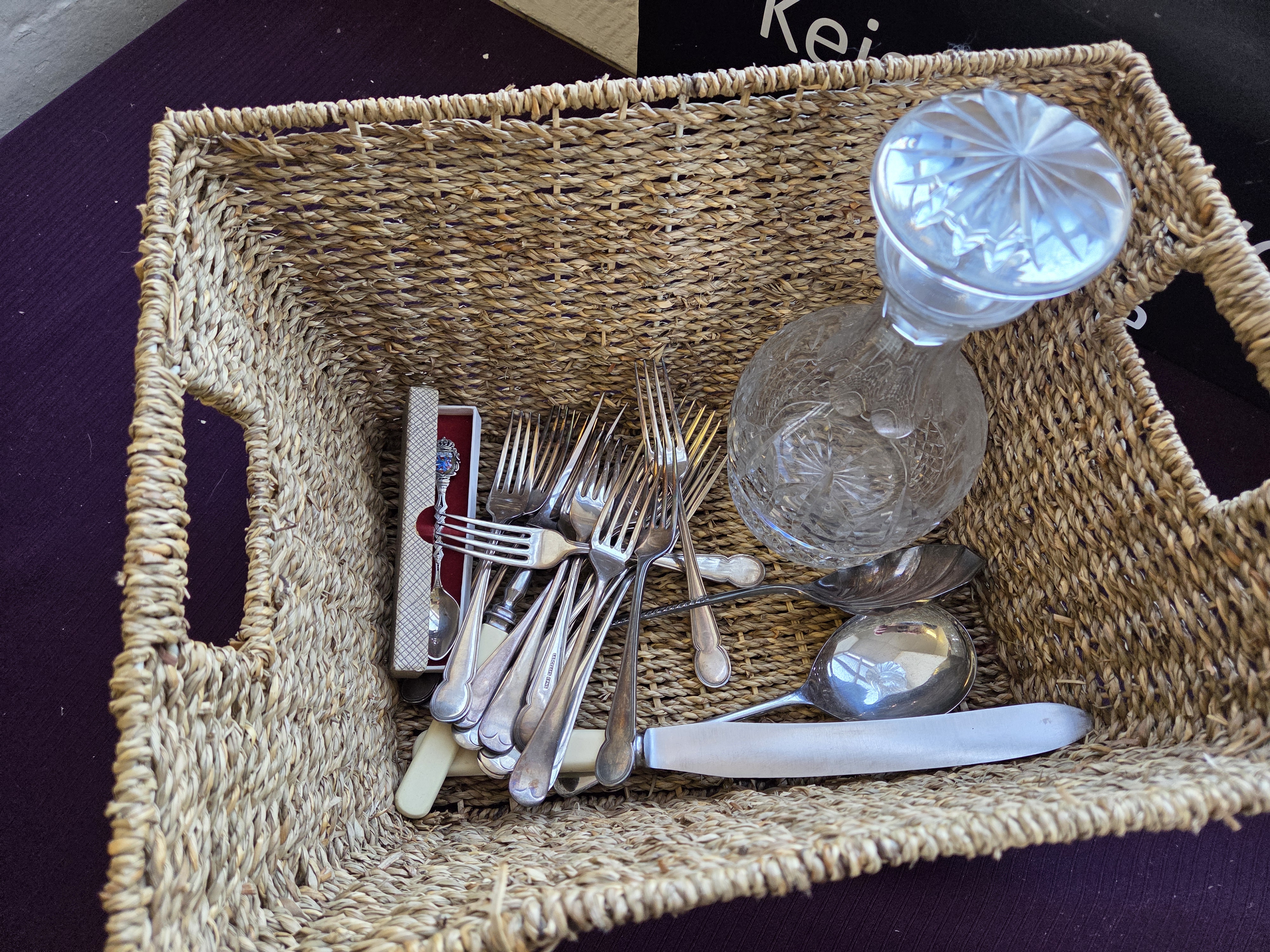 Lot 382 A Collection of Silver Plated Flatware, a Cut Glass Decanter, and a Souvenir Spoon in a Woven Basket