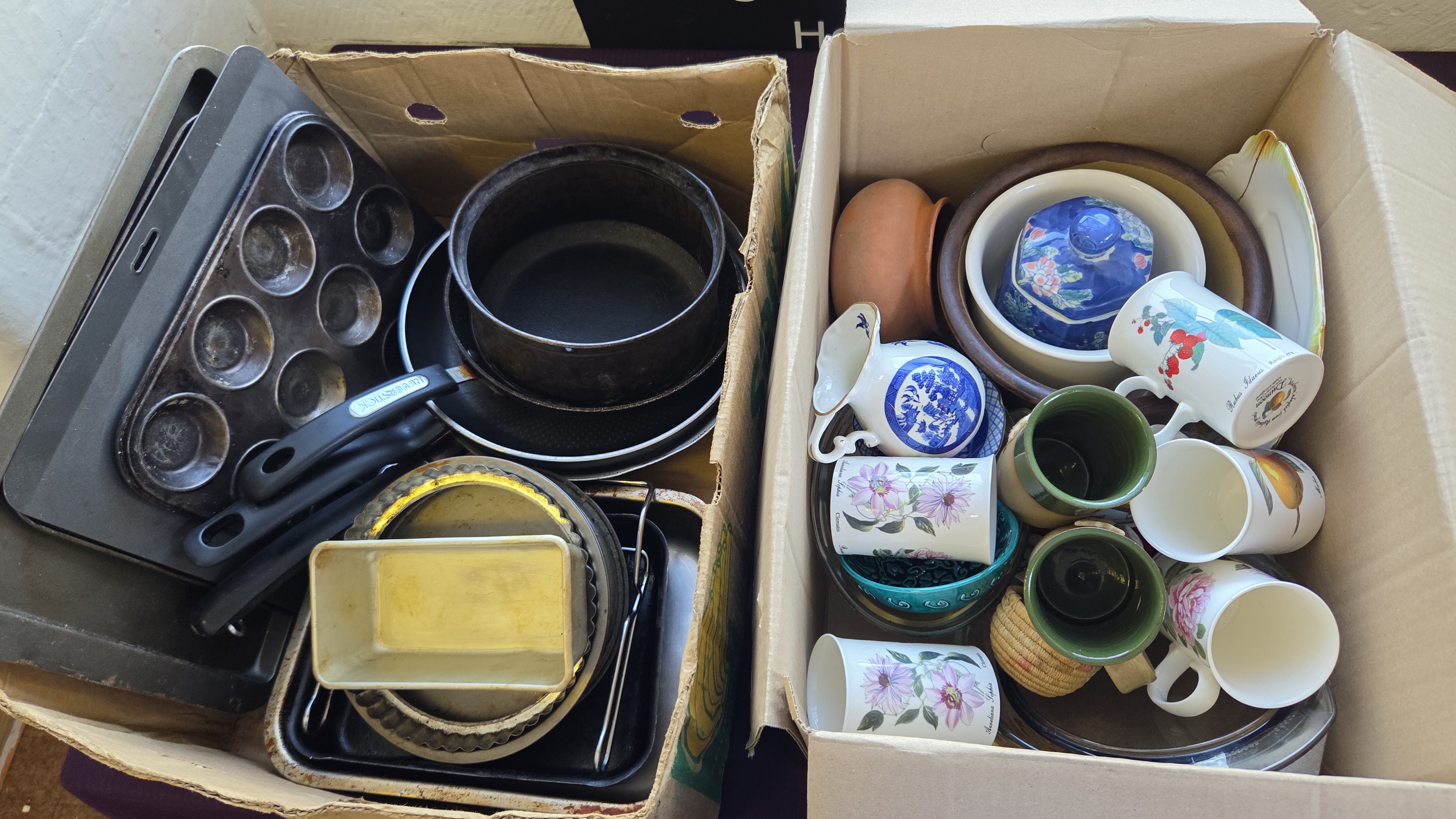 Lot 92 Two Boxes of Metal Bakeware, Cookware, and Ceramic Tableware