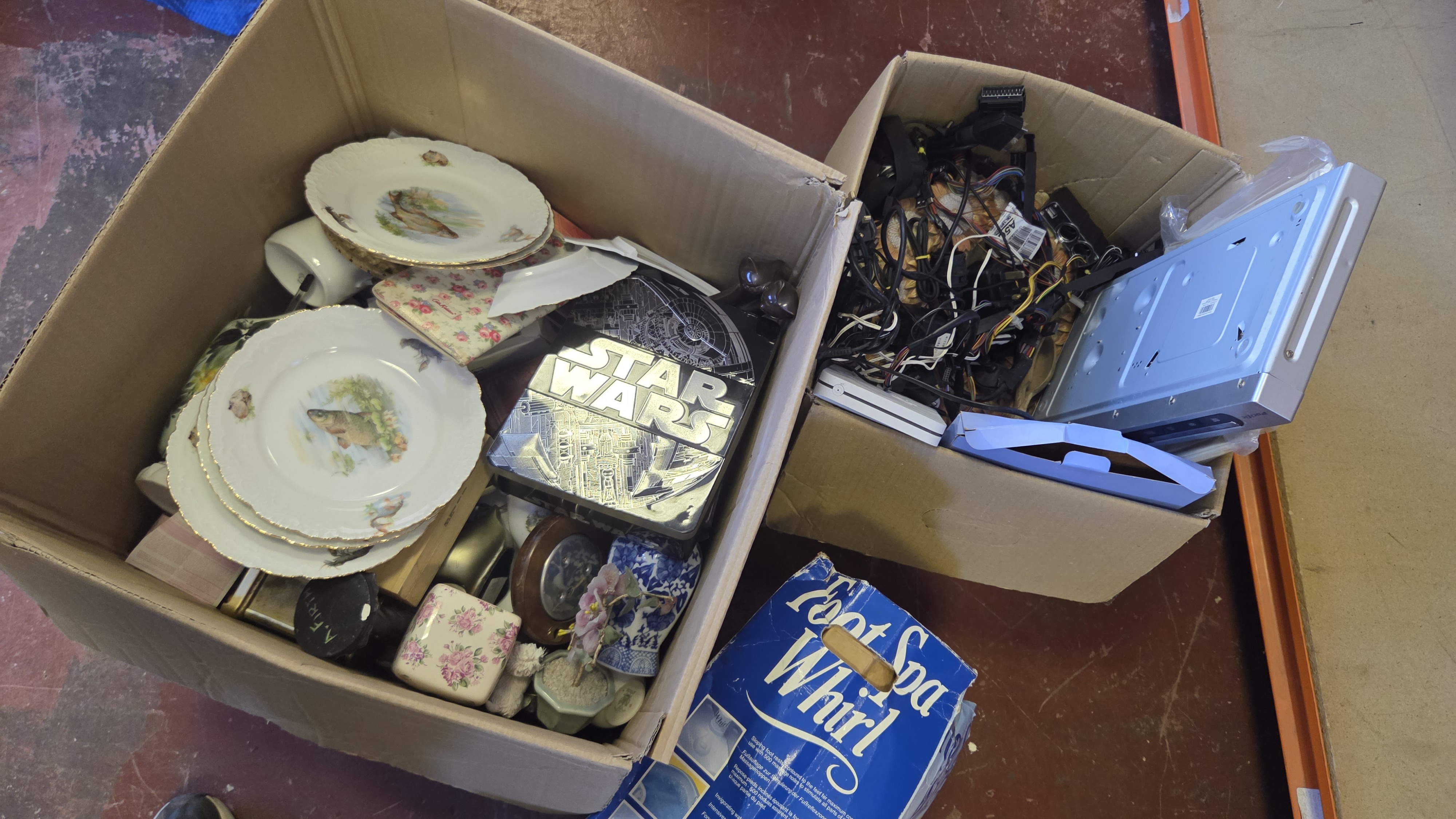 Lot 125 Two Boxes of Household Goods, Ceramics, Star Wars Collectables, and Electronics