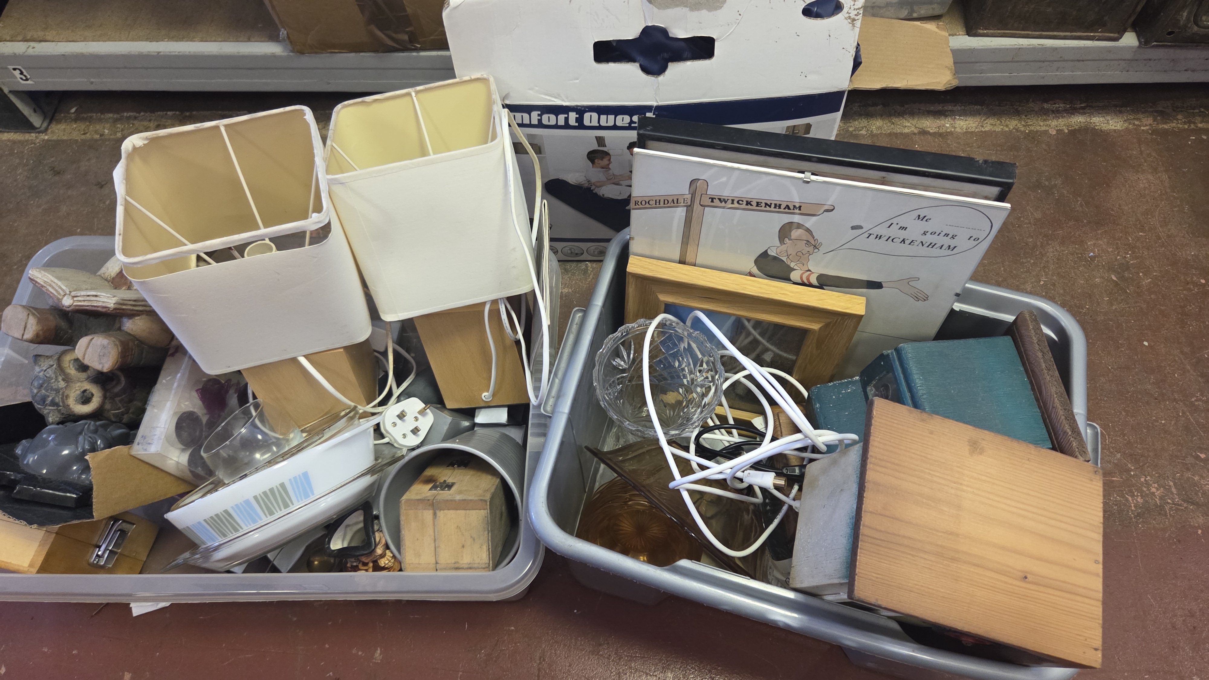 Lot 216 Two Boxes of Household and Decorative Sundries Including Lighting Glassware and Wooden Items and Airbed