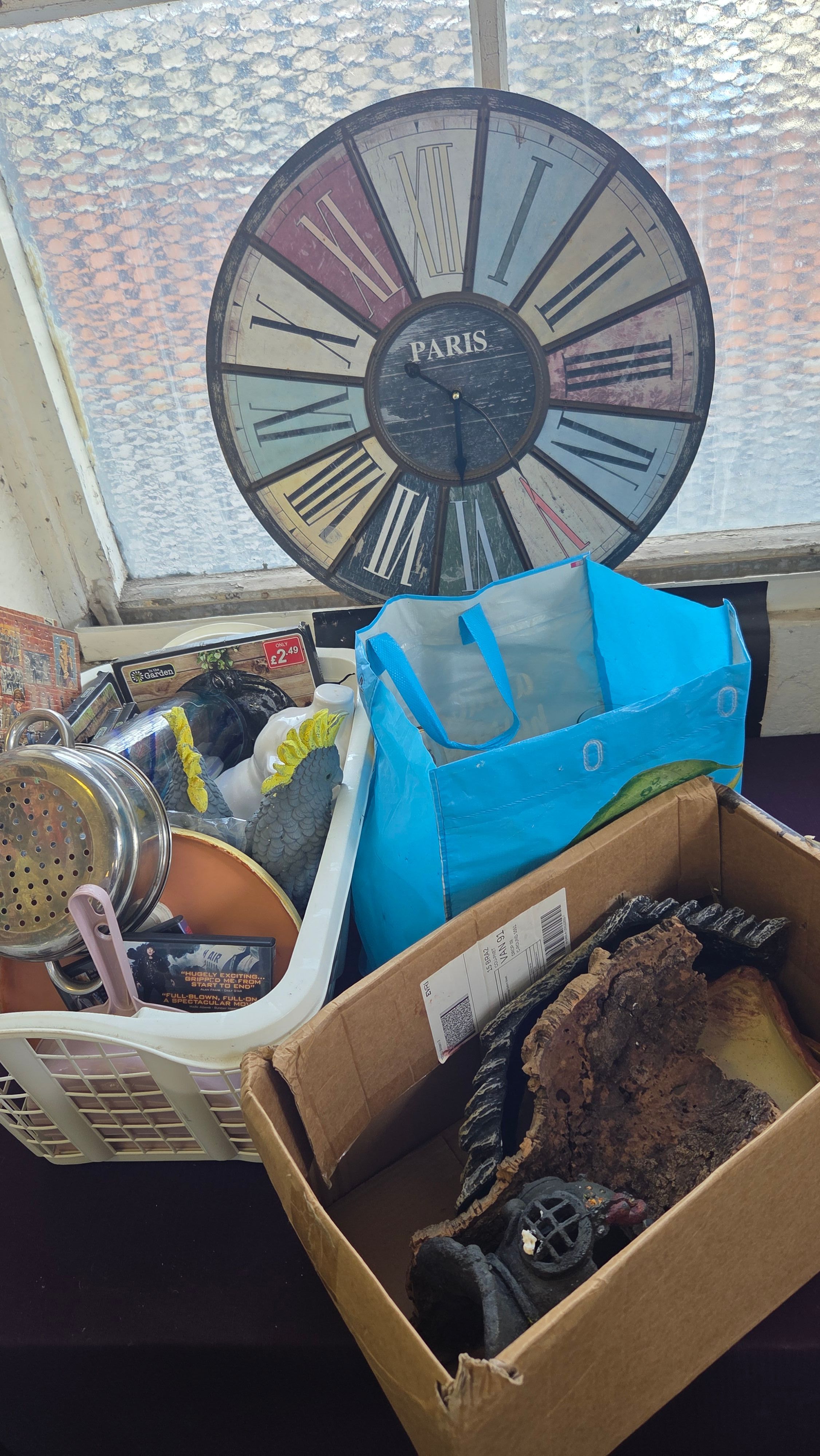 Lot 256 Basket, Box and Bag of Decorative Objects Glassware and Household Goods including a Large Wall Clock and Cockatoo Figurines