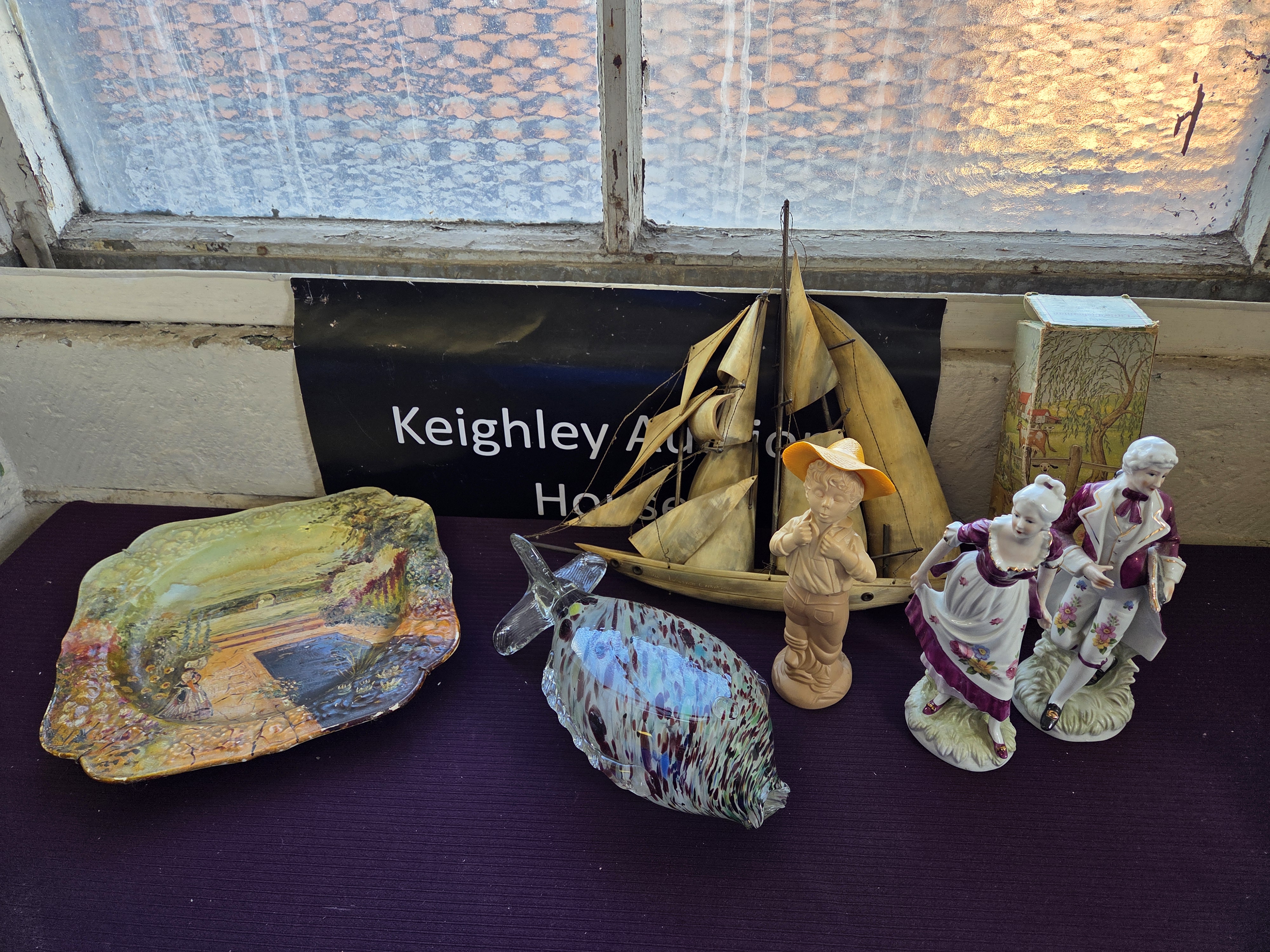 Lot 302 A Collection of Decorative Objects including Porcelain Figurines, Glassware, and a Model Ship