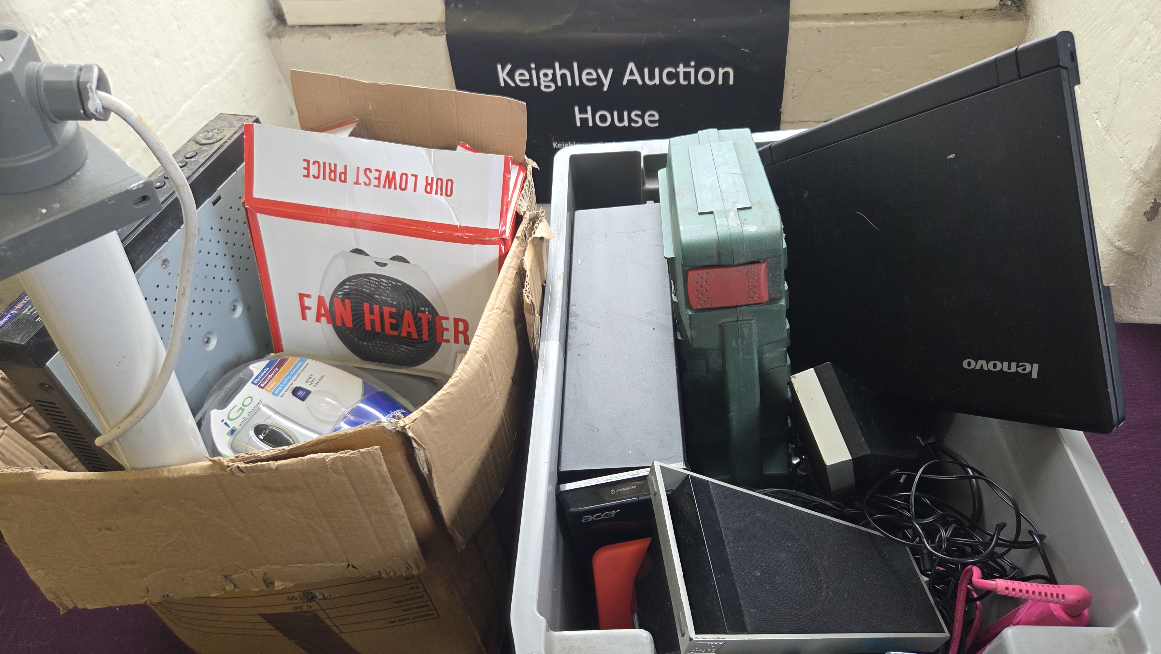 Lot 82 Two Boxes of Consumer Electronics and Household Items including Lenovo, Acer, and Bosch