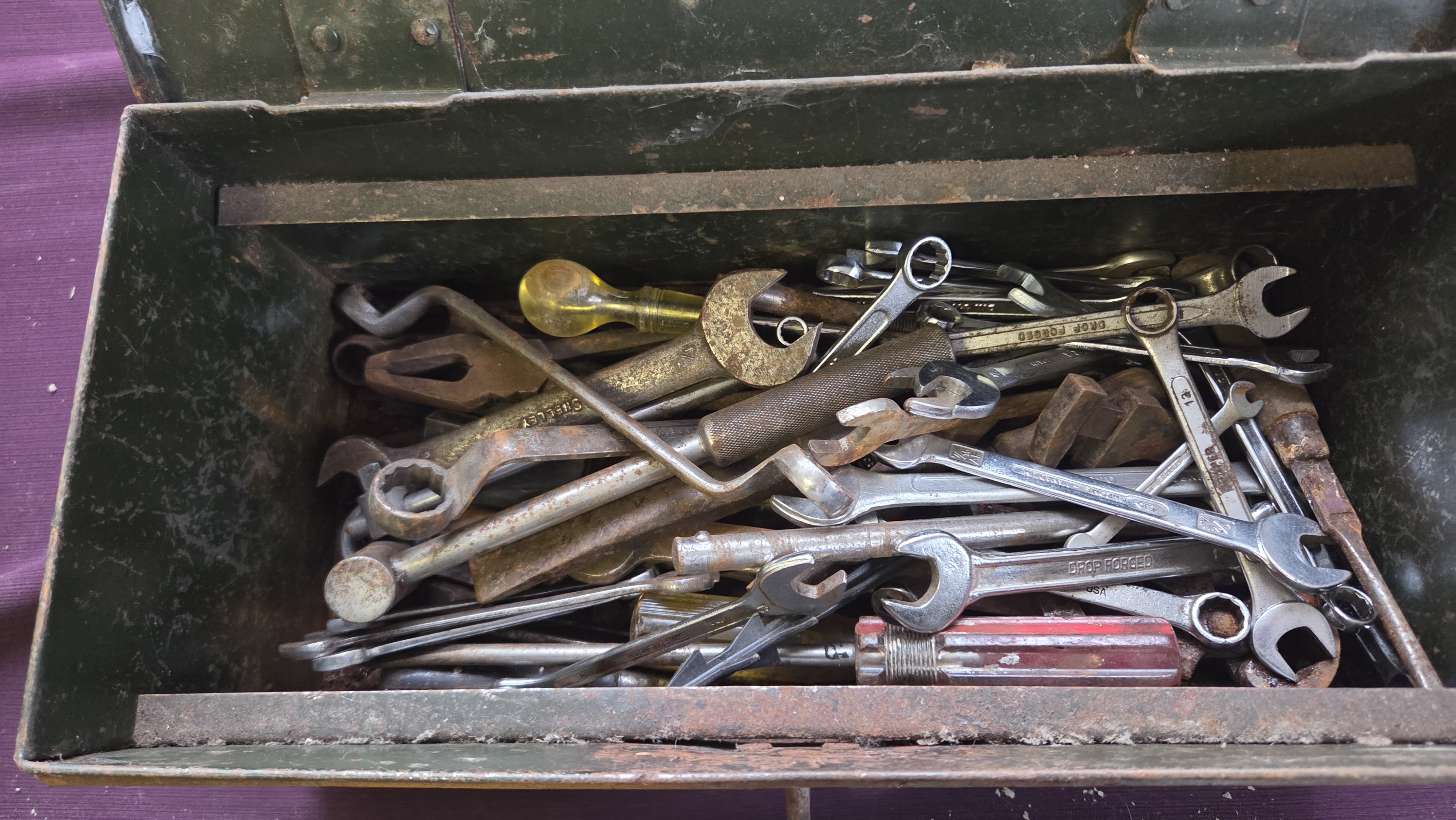 Lot 87 An Assortment of Vintage Automotive and Mechanical Hand Tools in a Steel Toolbox