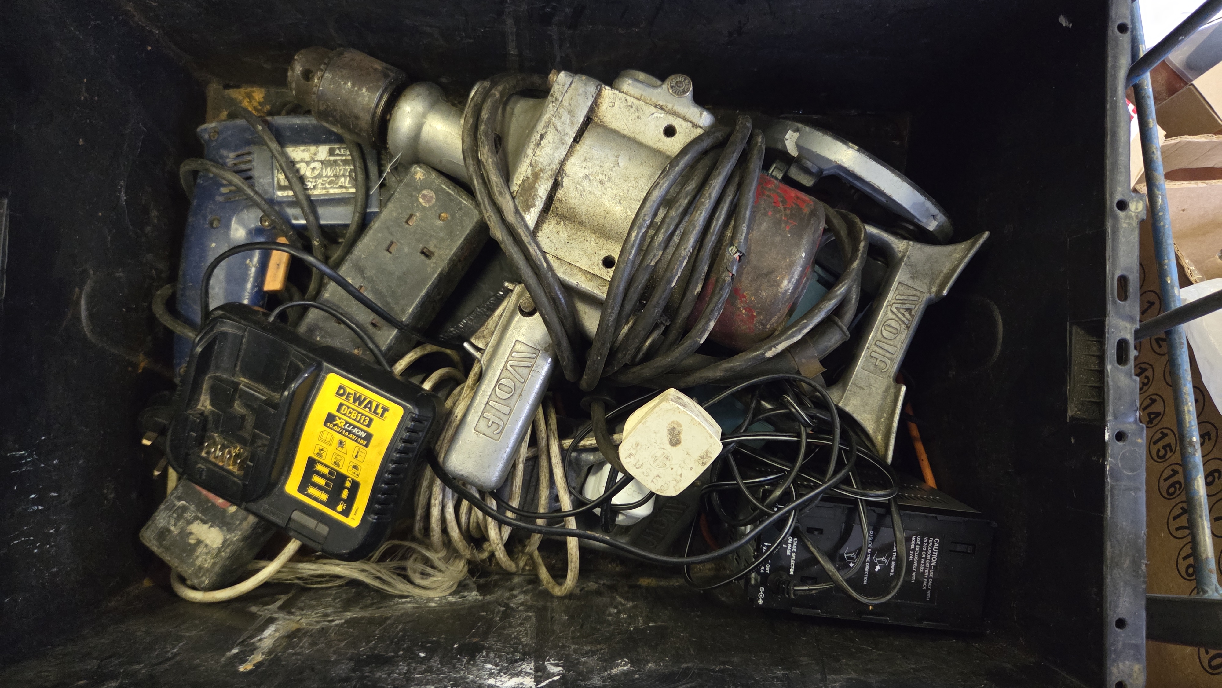Lot 145 An Assortment of Vintage and Modern Power Tools and Electrical Equipment including Wolf, AEG, and DeWalt