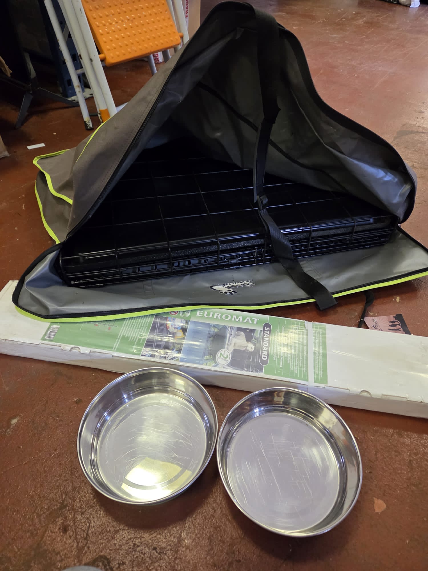 Lot 192 An Assortment of Pet Travel and Care Accessories Including Kisskas Pet Supplies Crate and Euromat Boot Mat