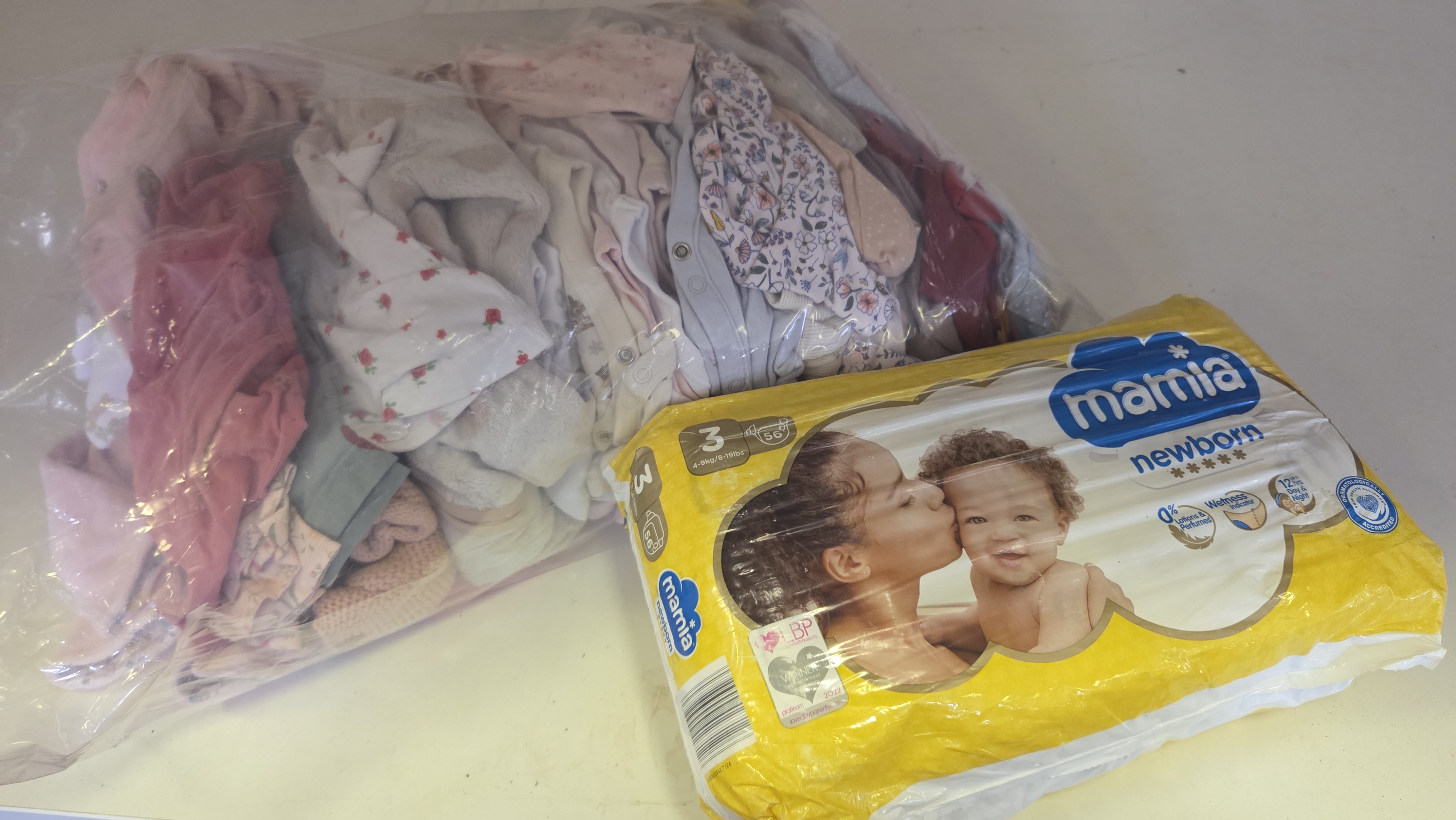 Lot 235 An Assortment of Infant Clothing and a Pack of Mamia Newborn Size 3 Nappies