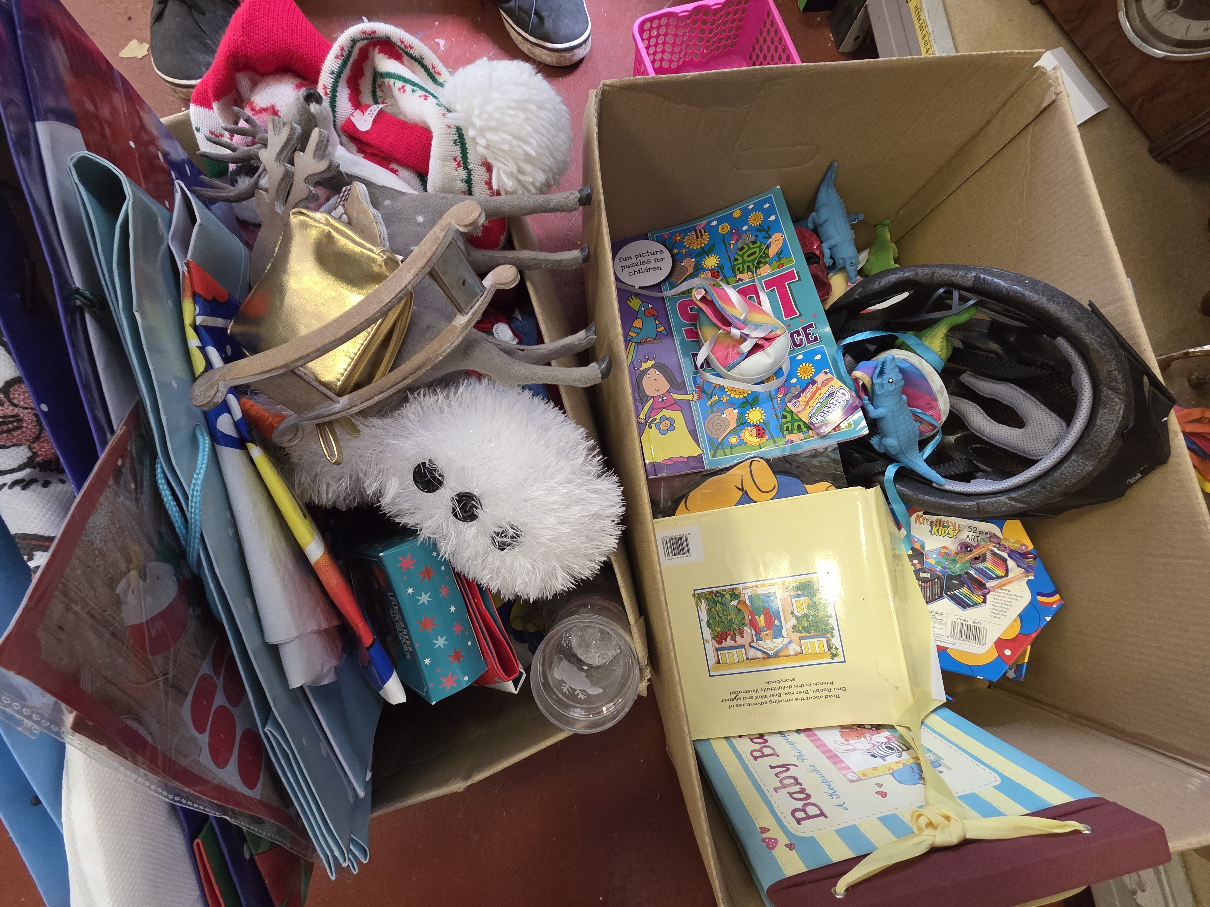 Lot 366 Two boxes of Children's Toys, Books, and Festive Accessories