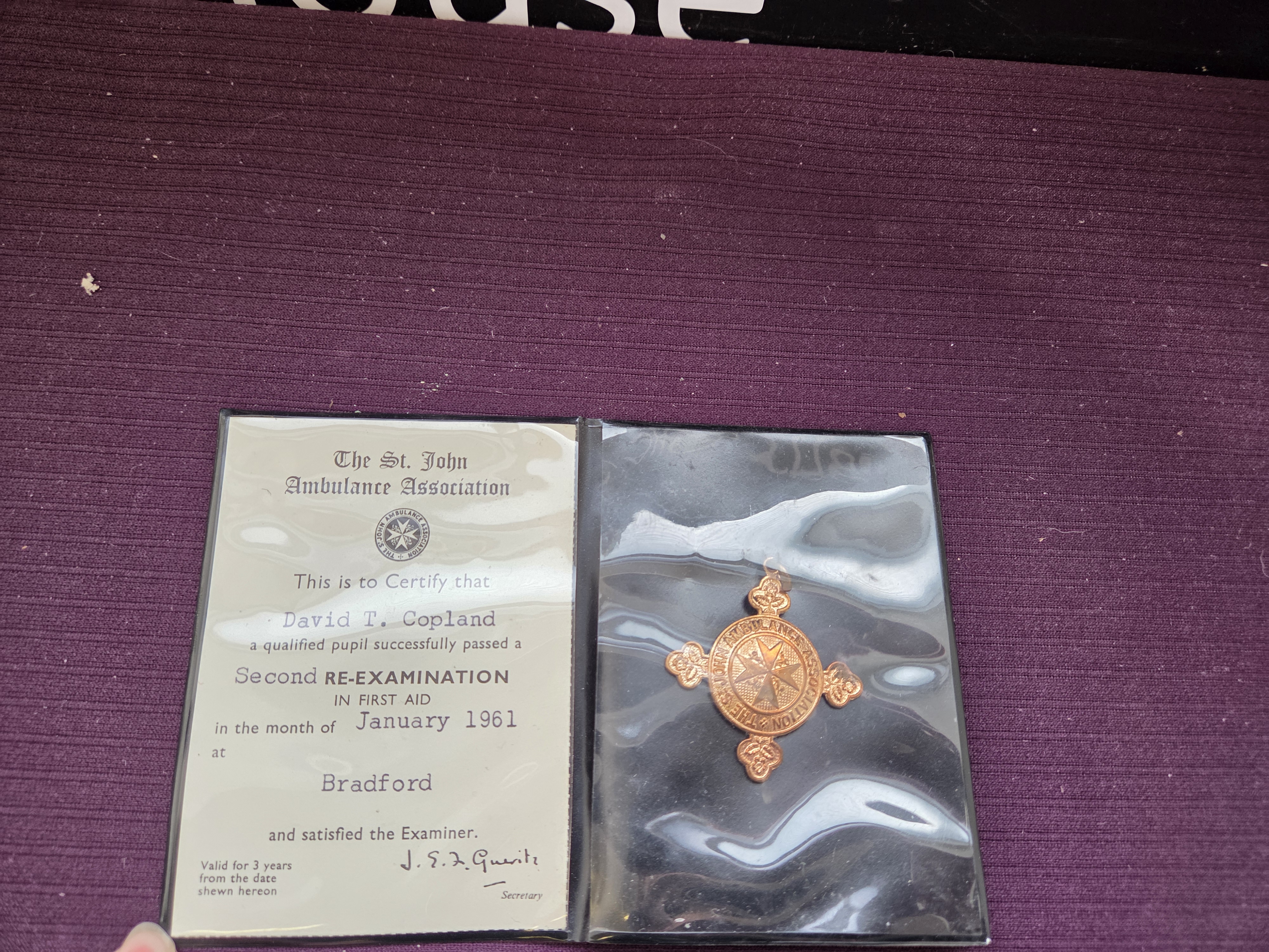 Lot 607 St. John Ambulance Association First Aid Certificate and Registered Medal, 1961