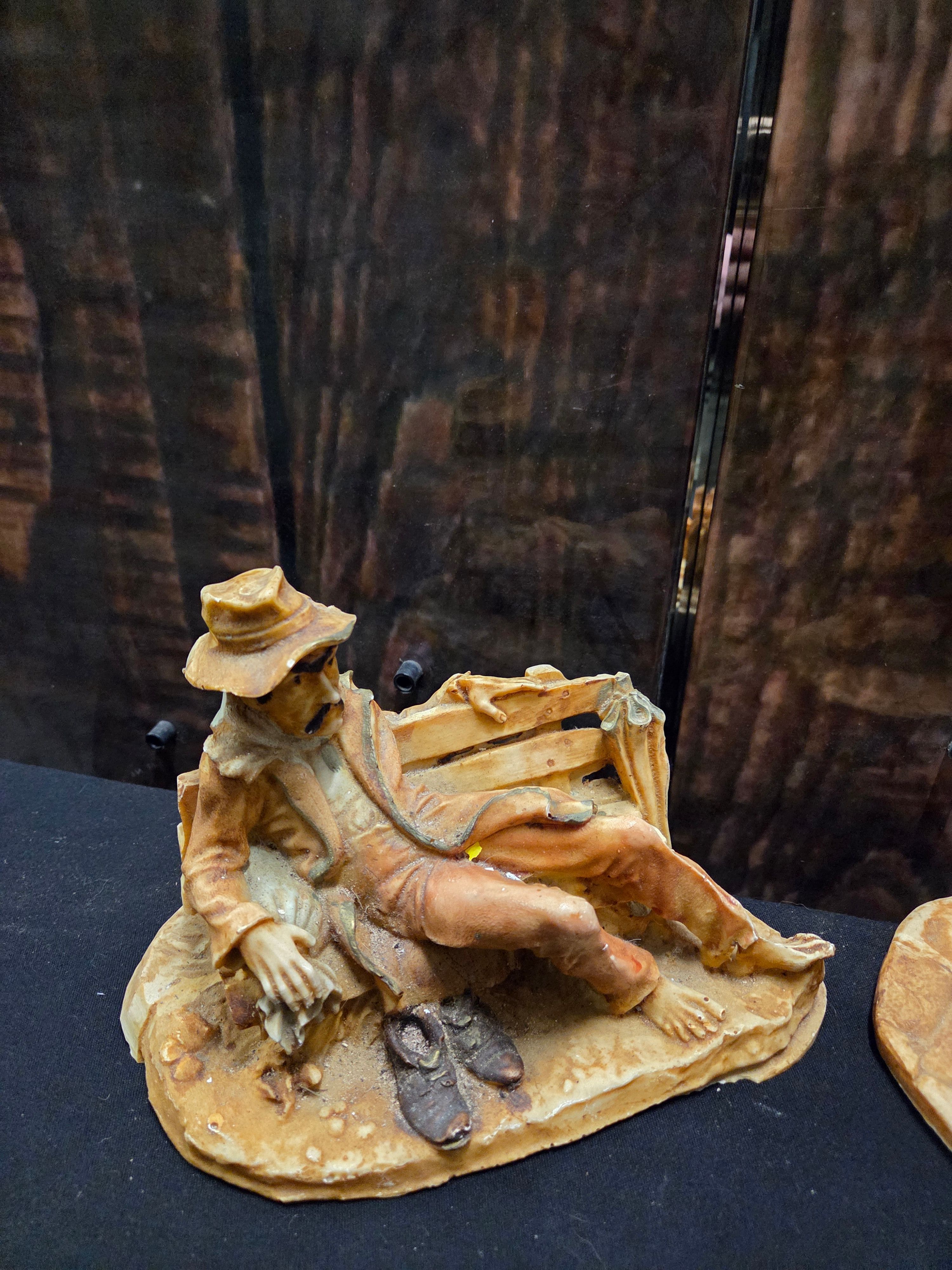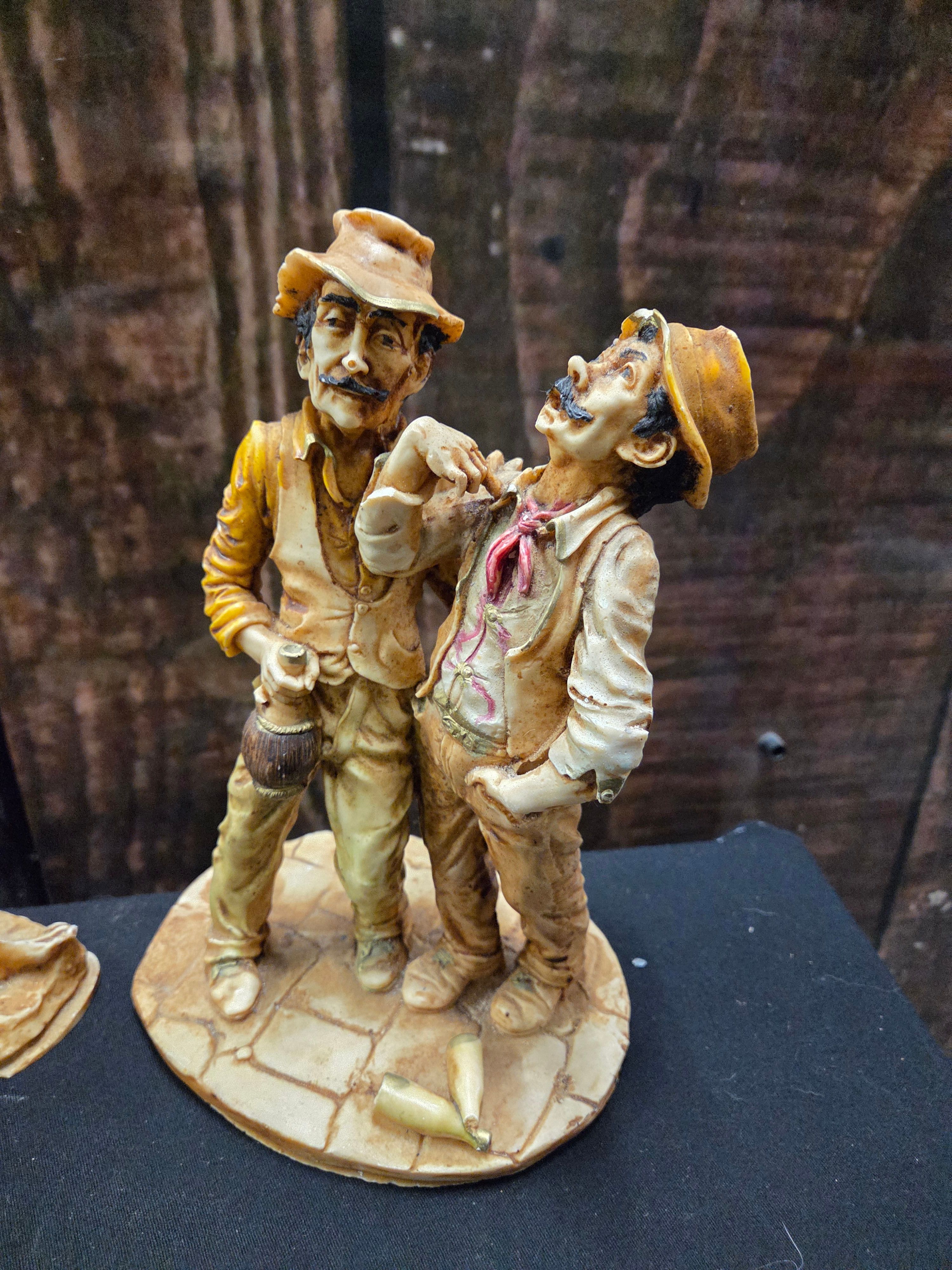 A pair of decorative figurines depicting men in rustic clothing, primarily coloured in shades of tan, cream, brown, and yellow.
