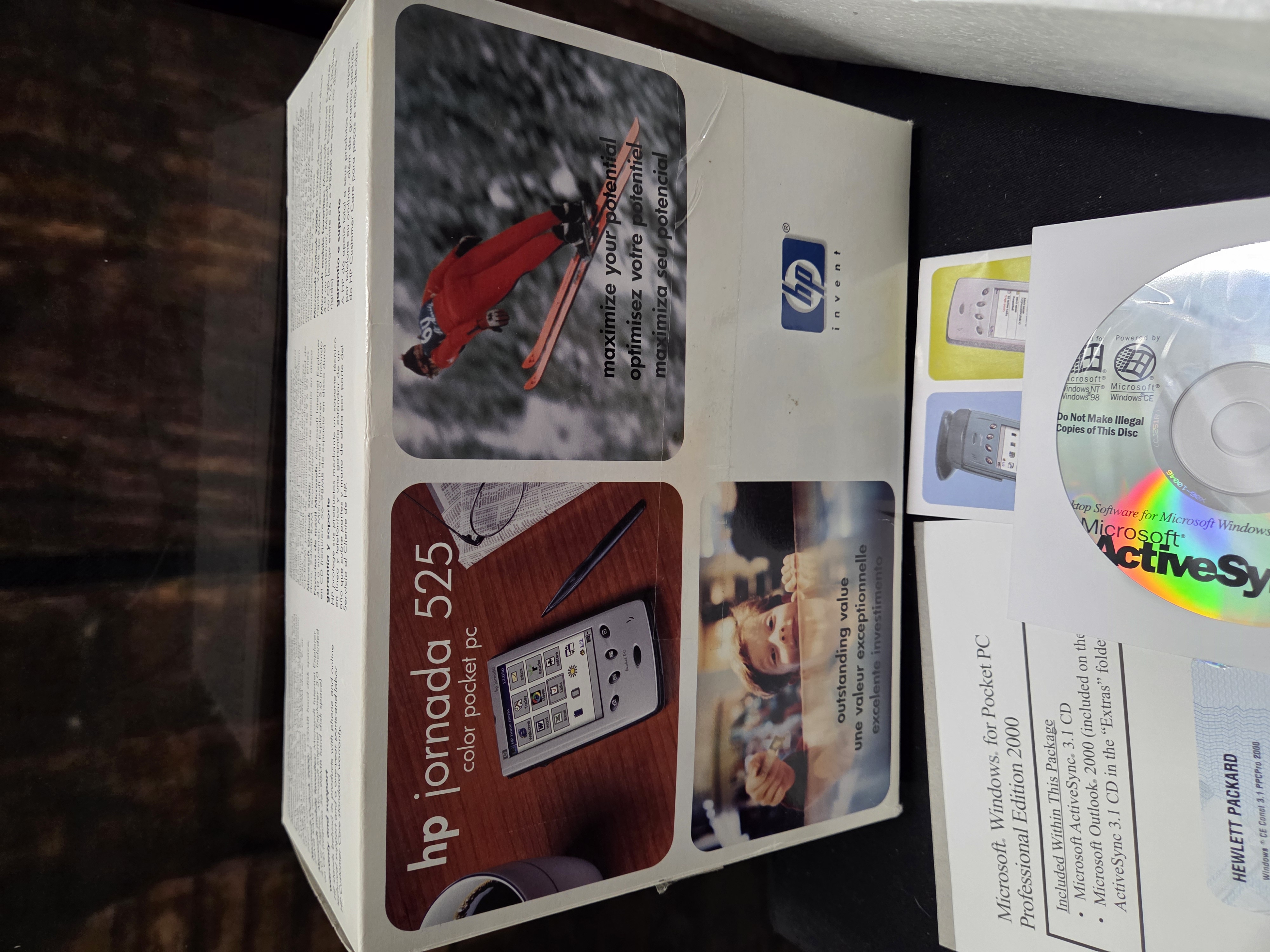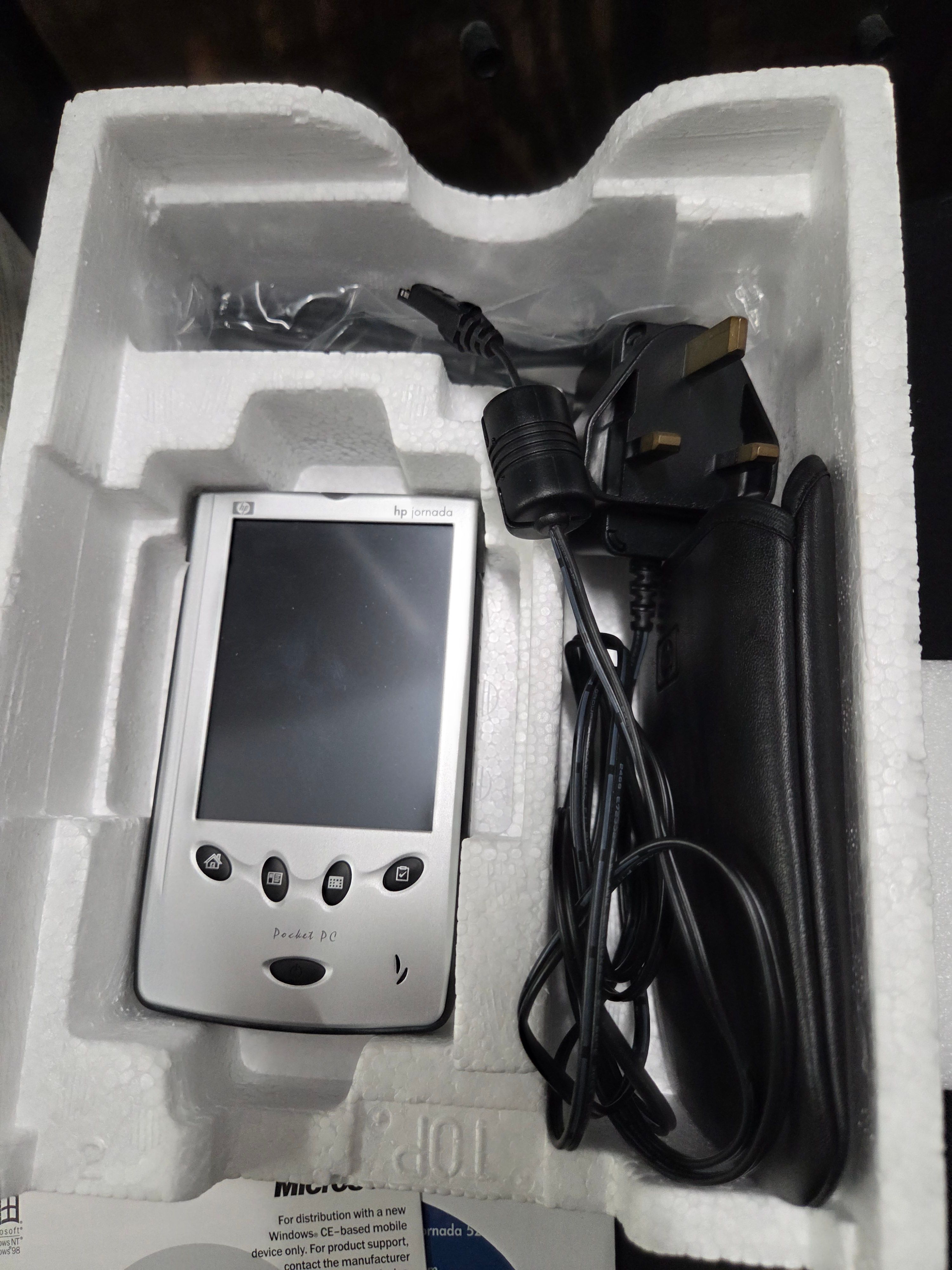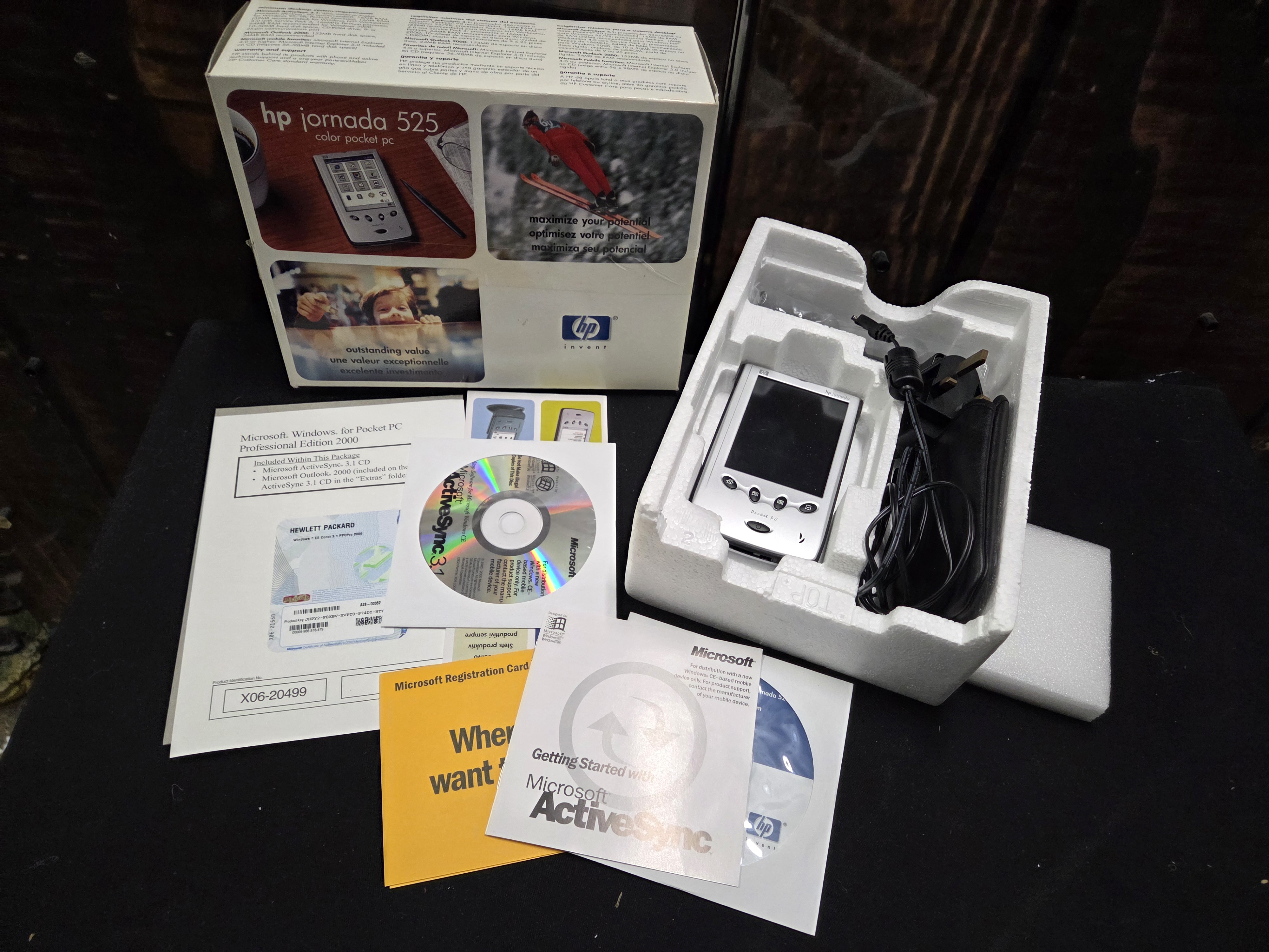 A collection of an HP Jornada 525 silver colour pocket PC including its original retail box, power adapter, carrying case, and software documentation.