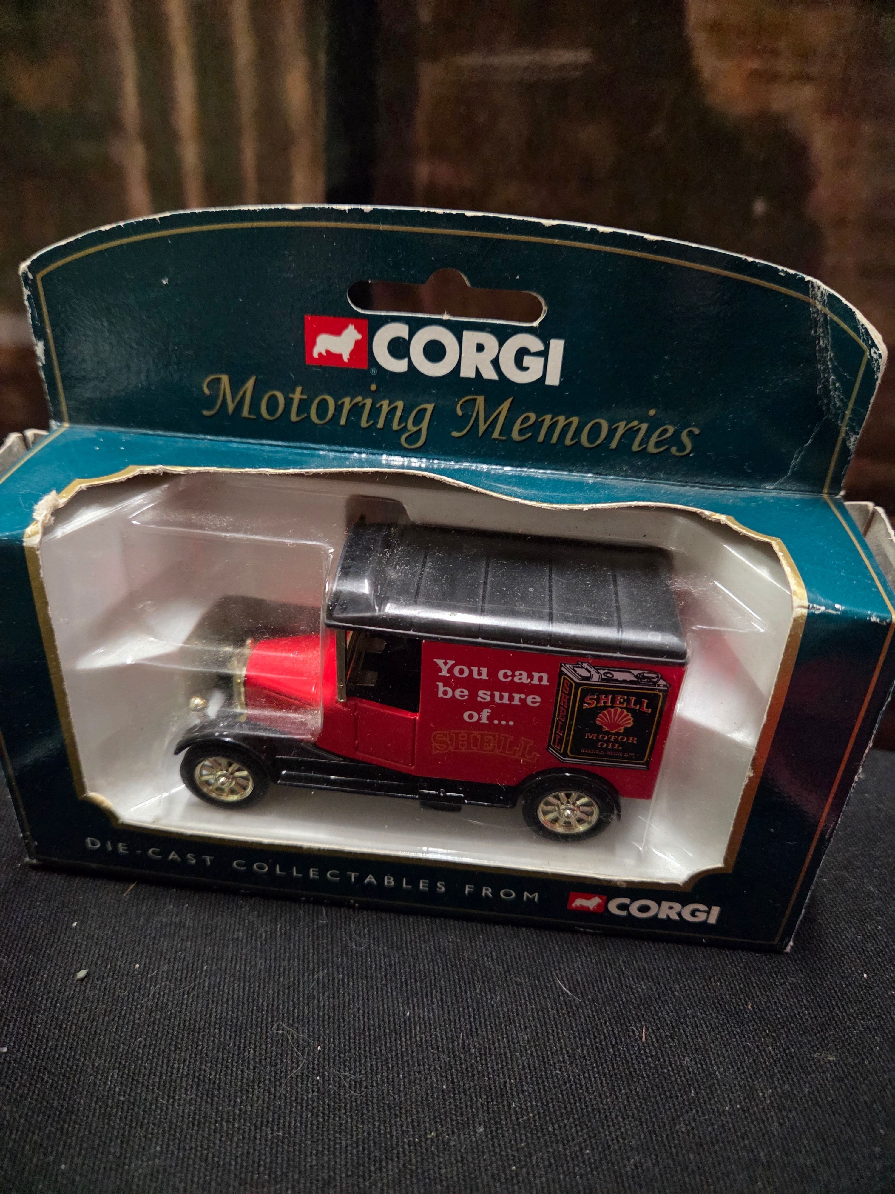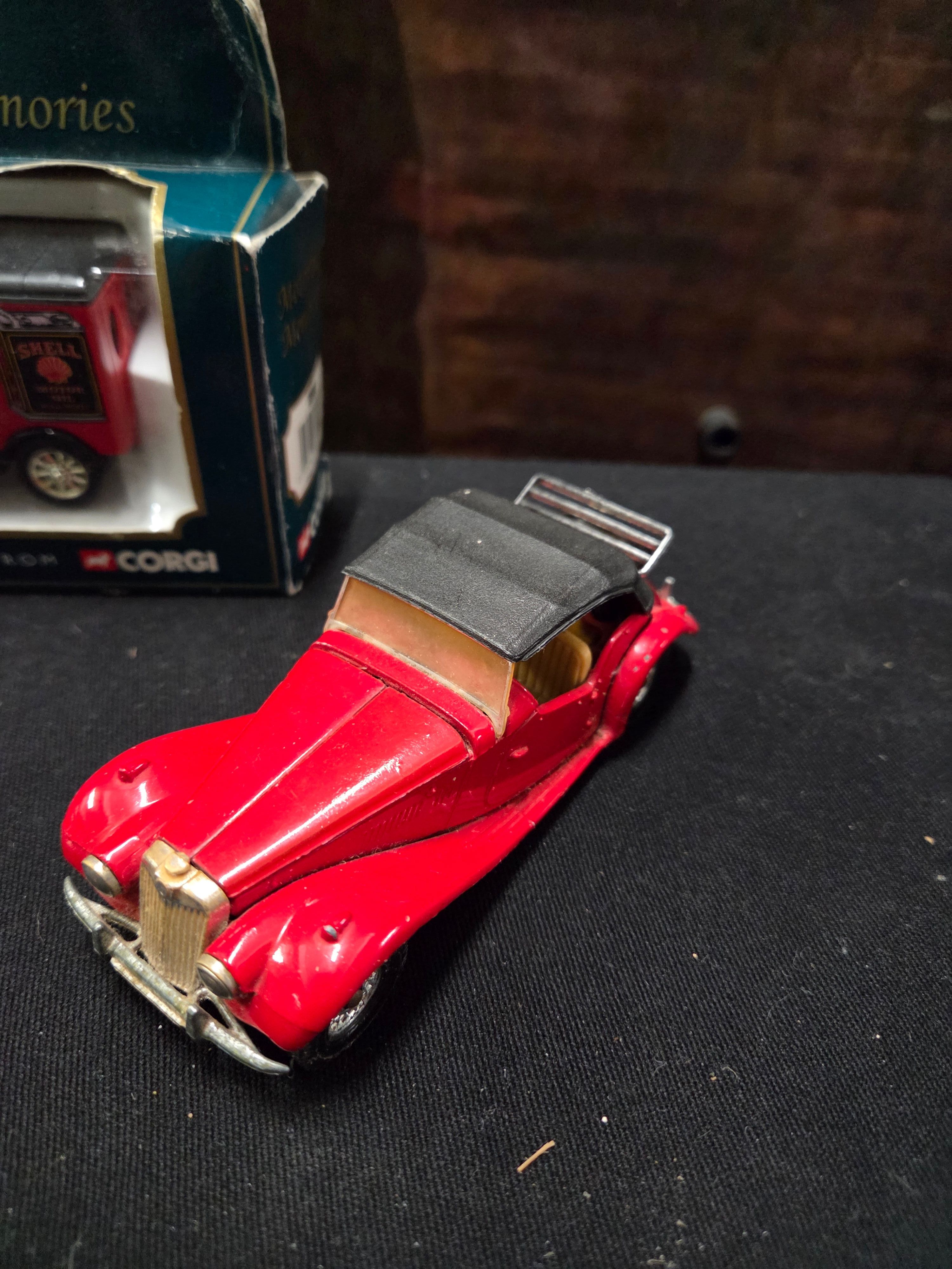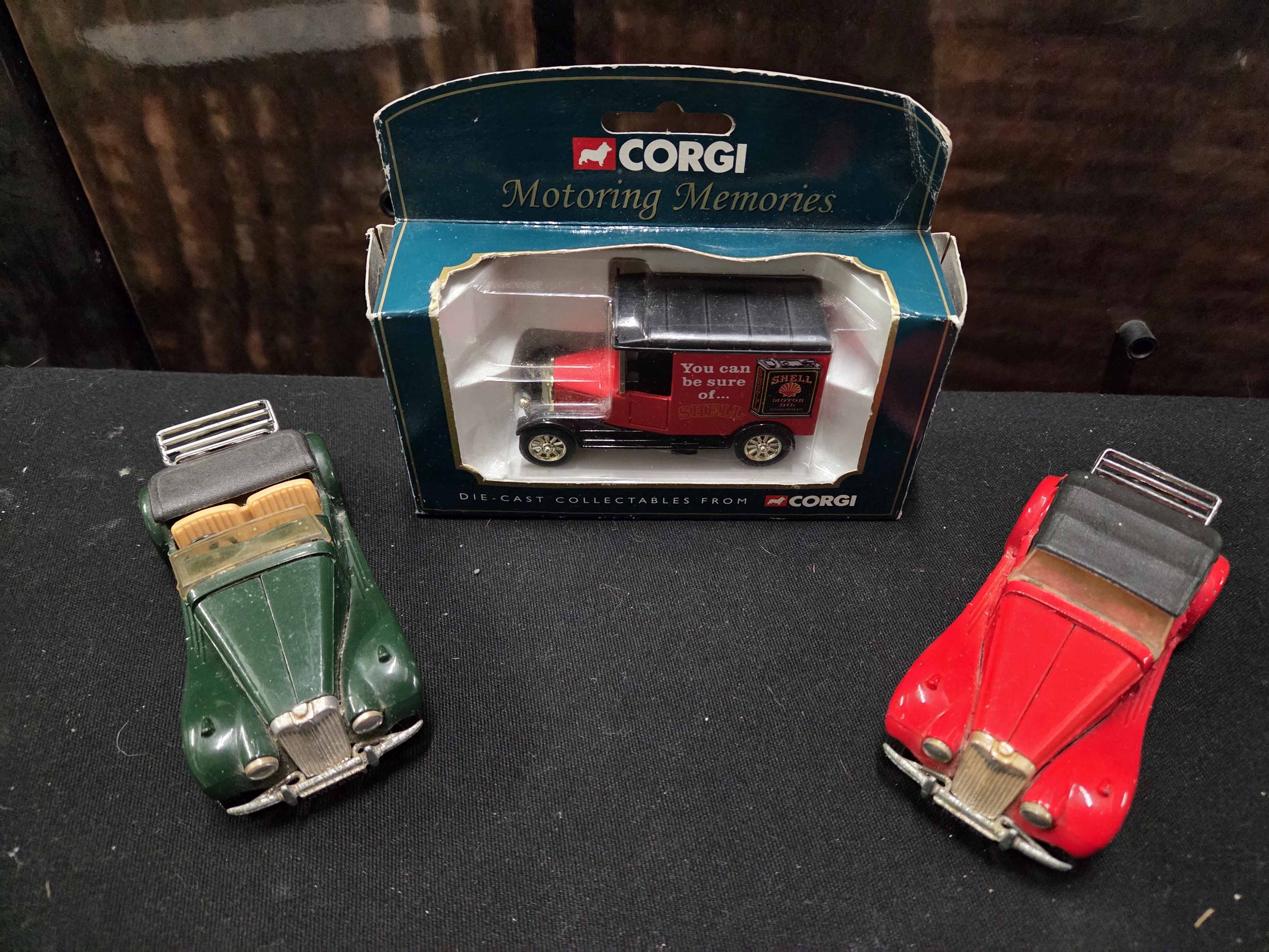 Lot 645 Three die-cast model vehicles including a boxed Corgi Motoring Memories Shell delivery van and two Corgi vintage-style roadsters